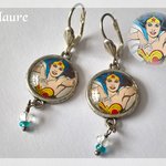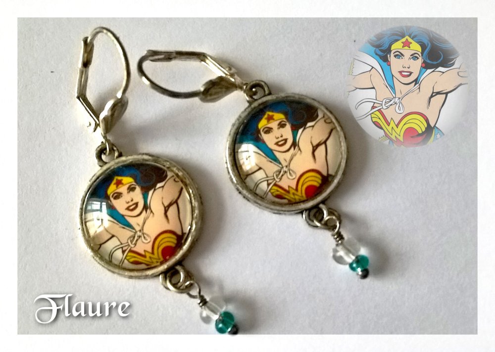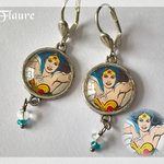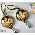 Des boucles d'oreilles en métal argenté et cabochons de verre sur le thème : wonder woman... Elles sont ornées de petites perles de verre.