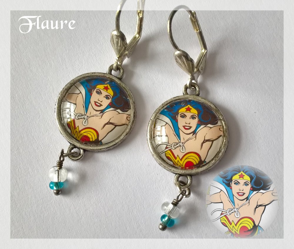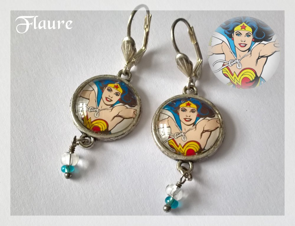 Boucles d'oreilles métal argenté et cabochons de verre "wonder woman", bijoux cabochon, bijoux wonder woman, bijoux amusants, cadeau, Noel, anniversaire