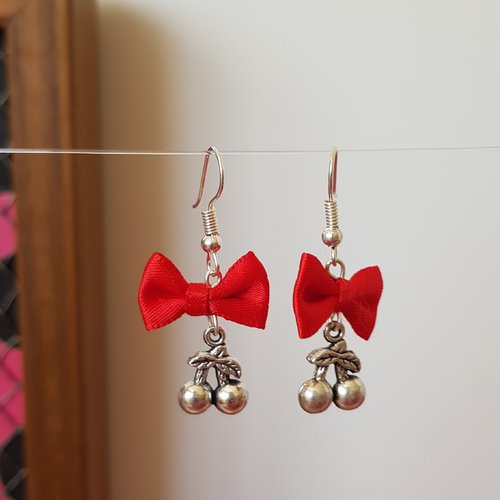 Boucles d'oreilles pendantes avec cerises en métal argenté et nœud en ruban satin rouge , jolies et rétro ! 🎀🍒