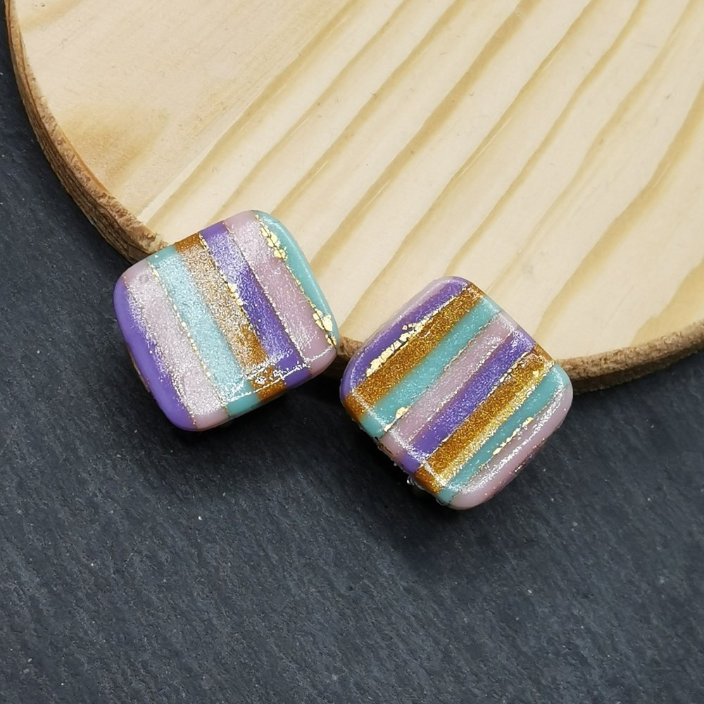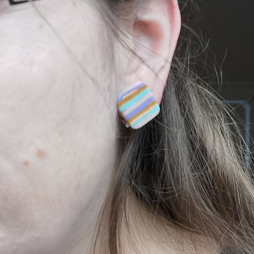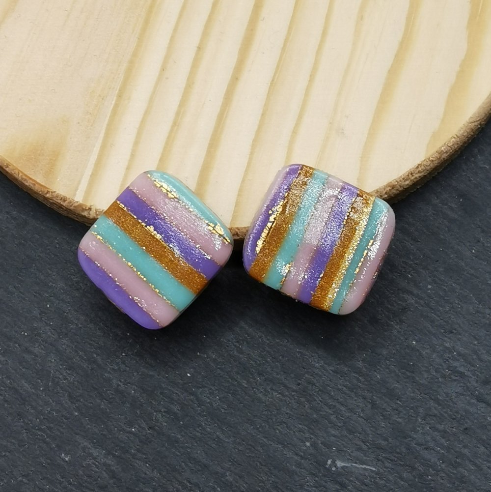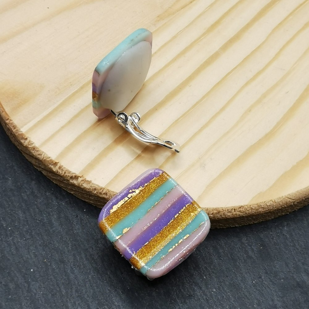 - Boucles d'oreilles en pâte polymère rayé rose, violet, vert menthe et doré