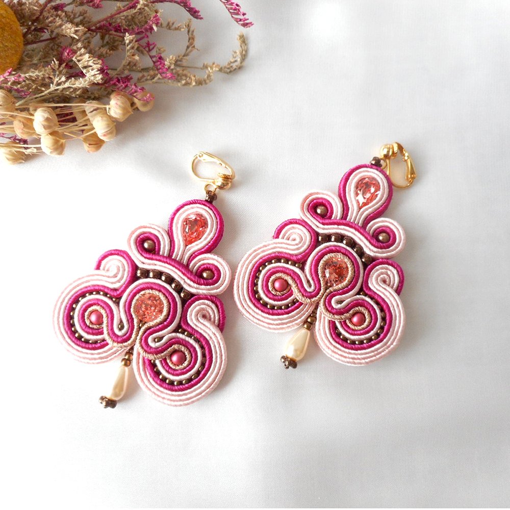 Boucles d'oreilles clips cousu main, en soutaches rose, ornées de cristaux scintillants, de perles en verre cuivré et d'une goutte en verre tchèque à la base pour une élégance subtile.