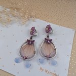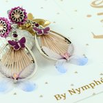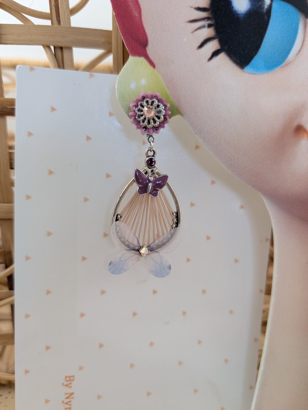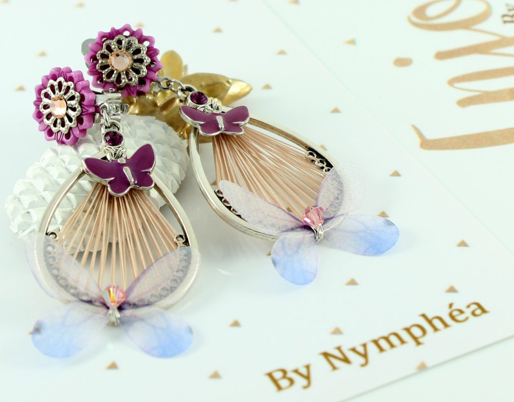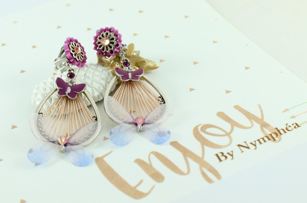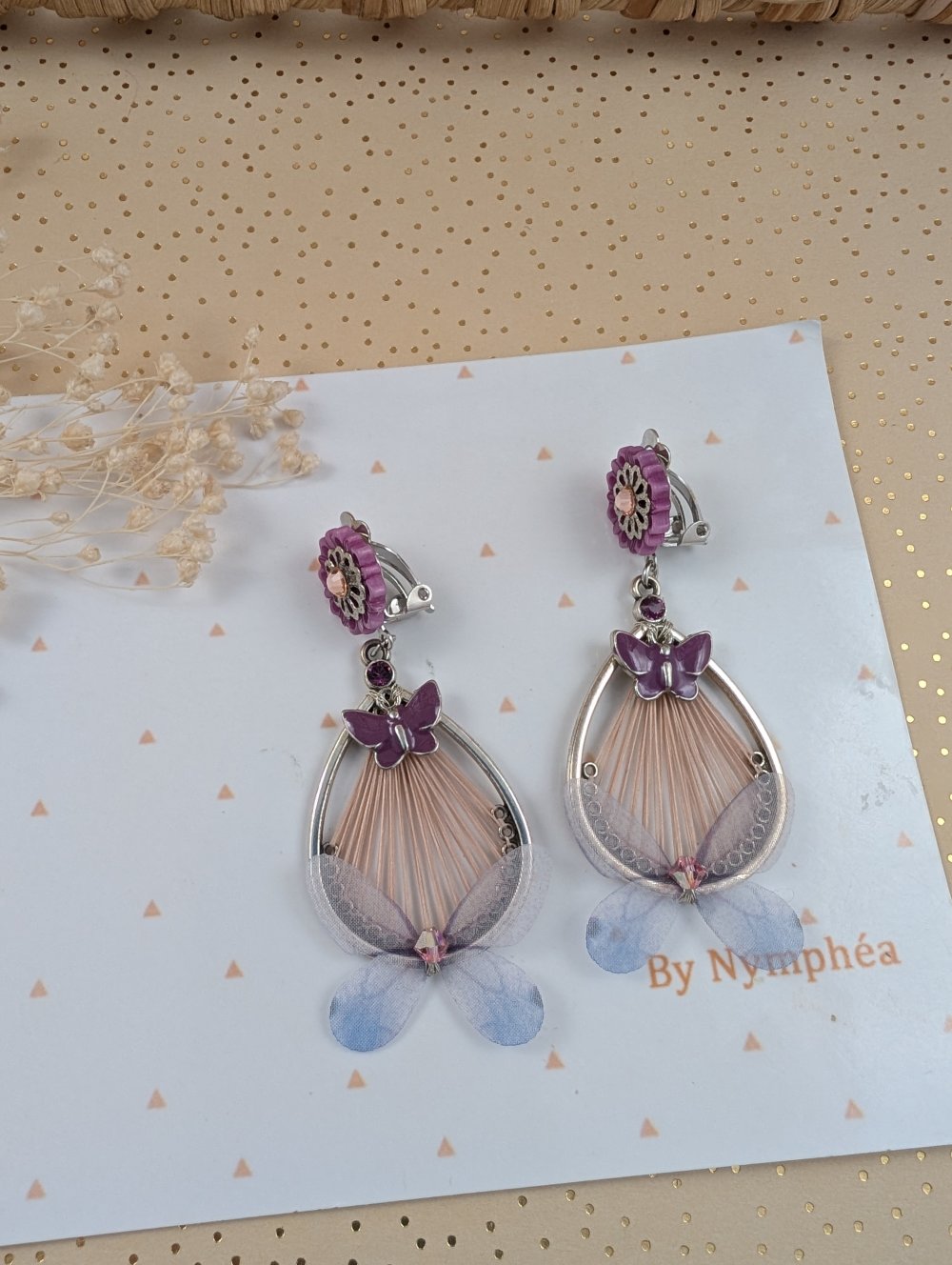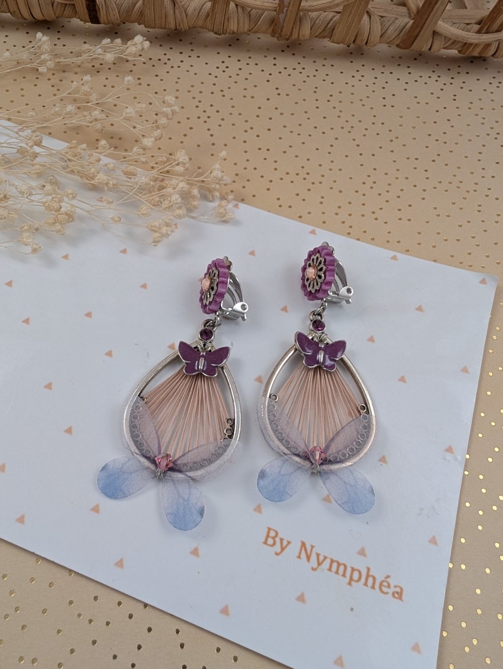 Boucles d'oreilles clips en nacre papillons organza et émaillé couleur prune, clips pour femme, idée cadeau fille, ByNymphéa