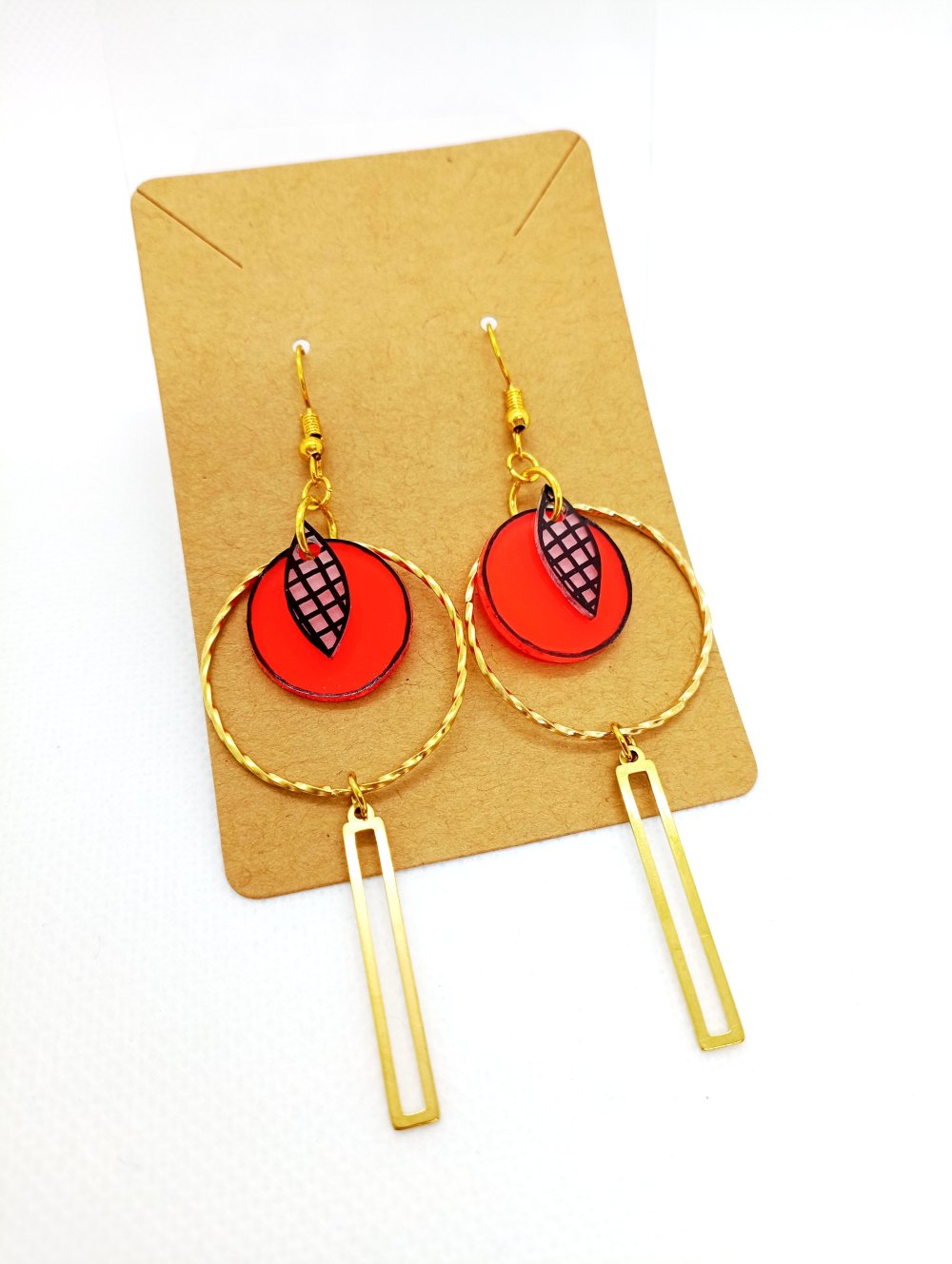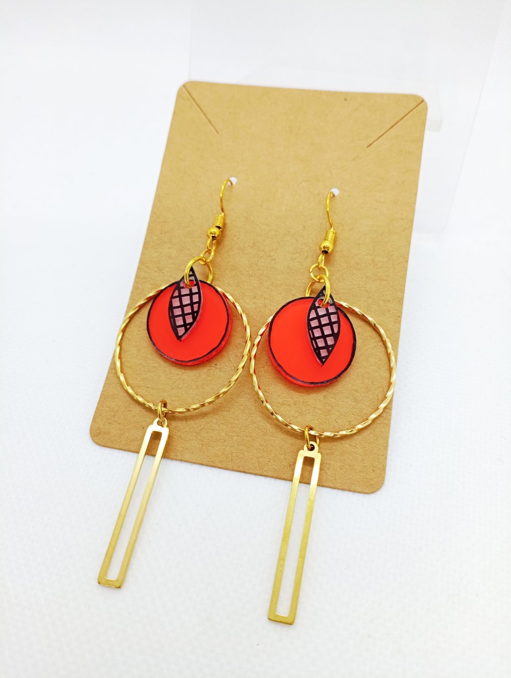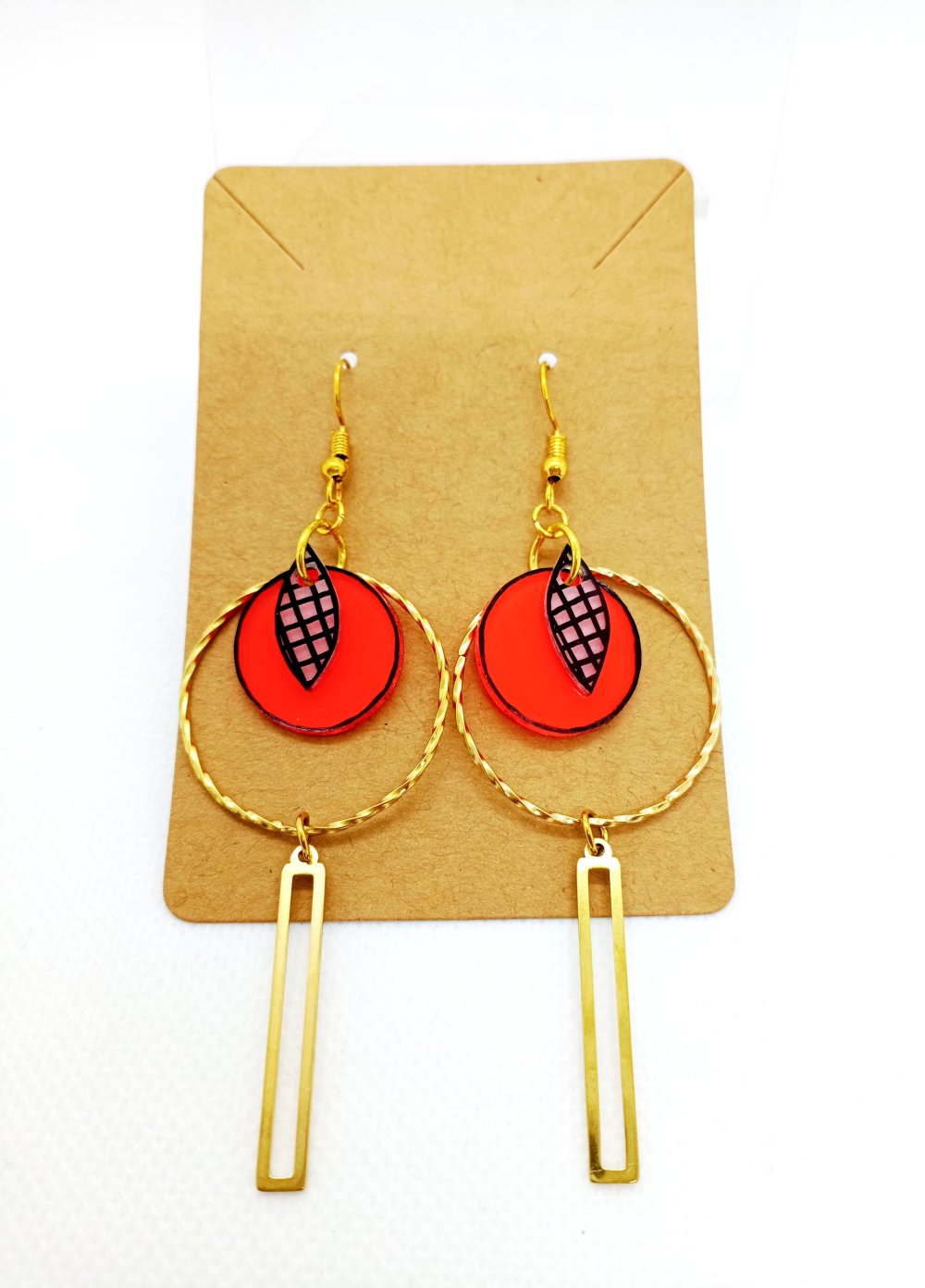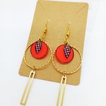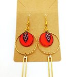 Paire de boucles d'oreilles en laiton doré avec pendentifs *fait main* motifs noirs sur fond transparent opaque et oranges.