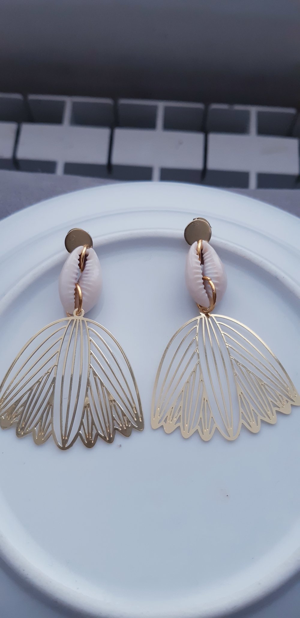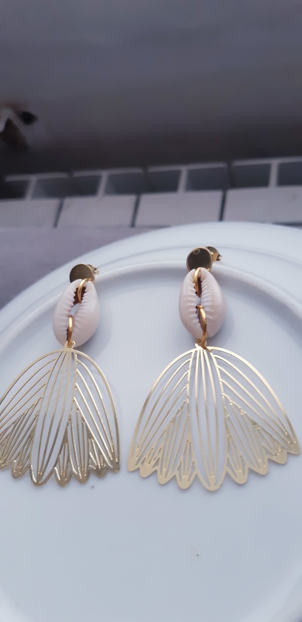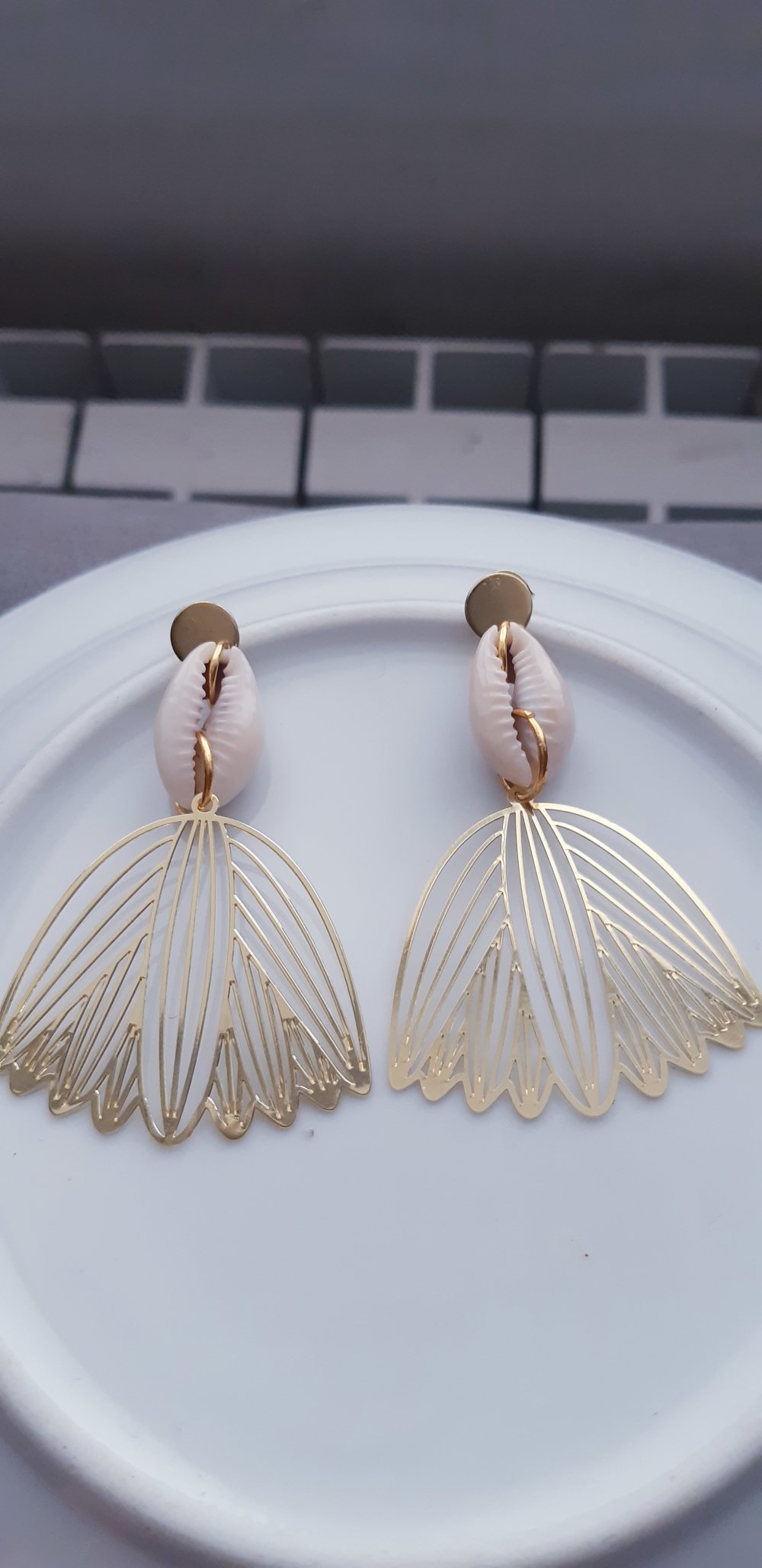 #bouclesdoreilles #bijoux #accessoires #creoles #bohemes #pendantes #coquillage #cauri #nacre #beige #creme #blanc #puces #dore #or #acier #metal #inoxydable #femme #cadeaufemme #faitmain #artisanal #fleur #estampe #filigrane #breloque #feuille