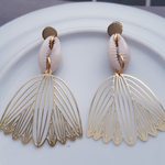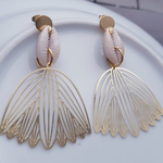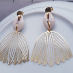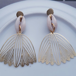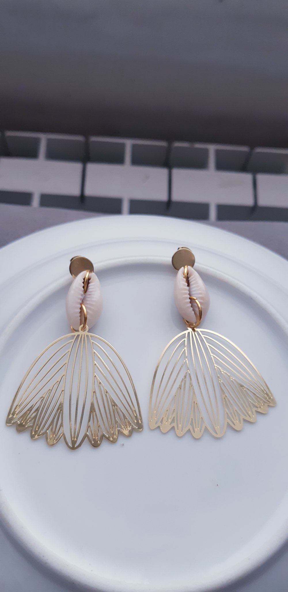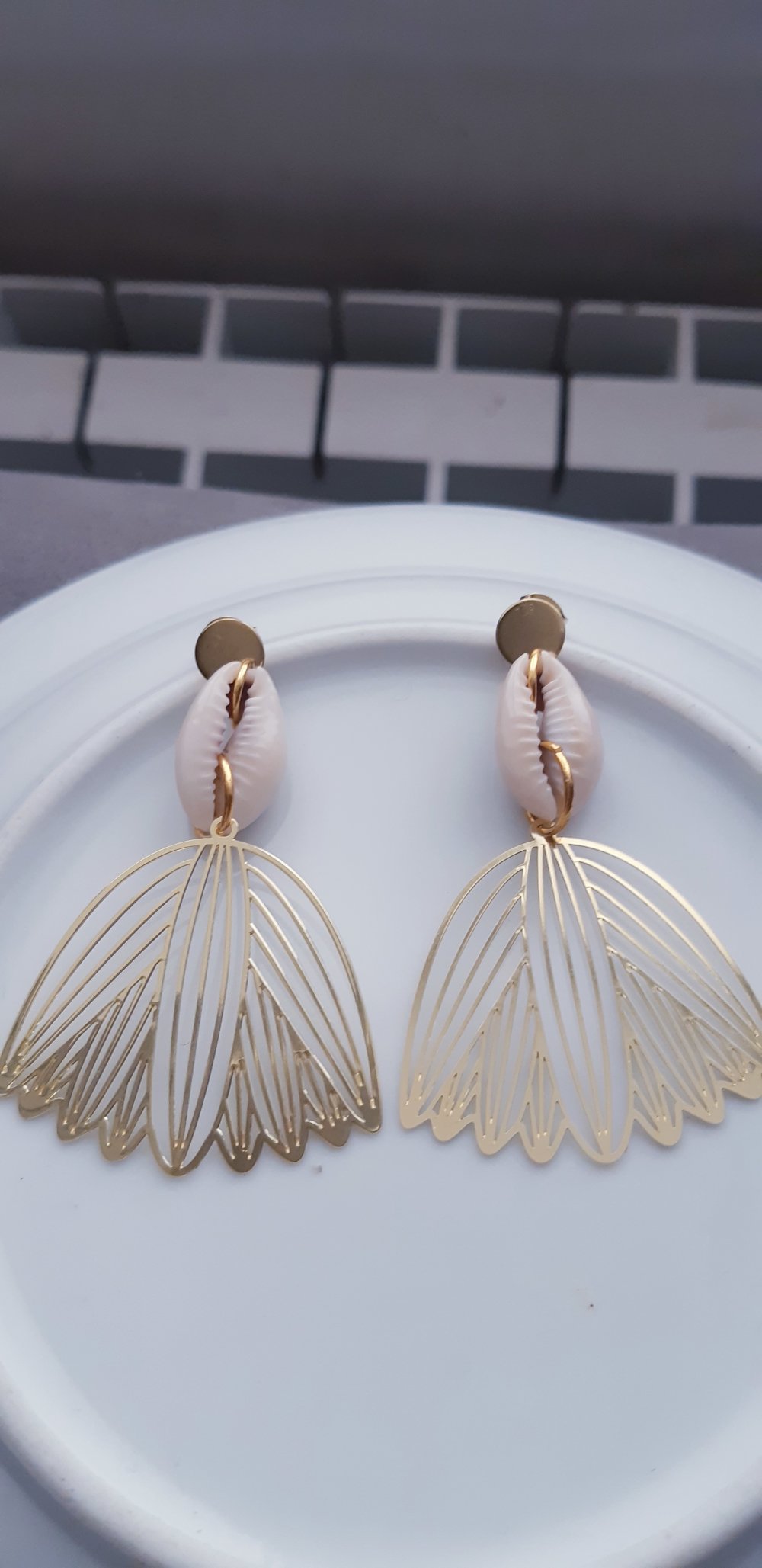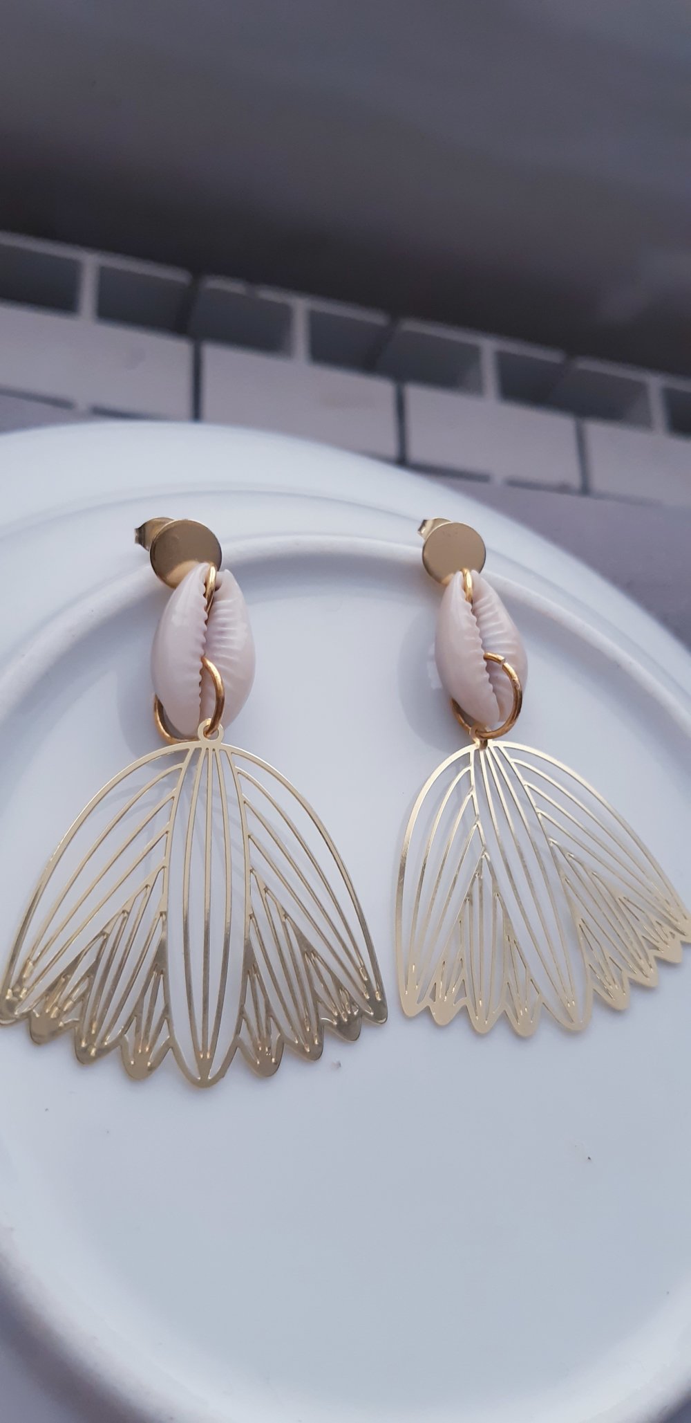 #bouclesdoreilles #bijoux #accessoires #creoles #bohemes #pendantes #coquillage #cauri #nacre #beige #creme #blanc #puces #dore #or #acier #metal #inoxydable #femme #cadeaufemme #faitmain #artisanal #fleur #estampe #filigrane #breloque #feuille