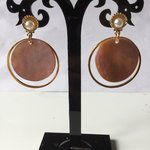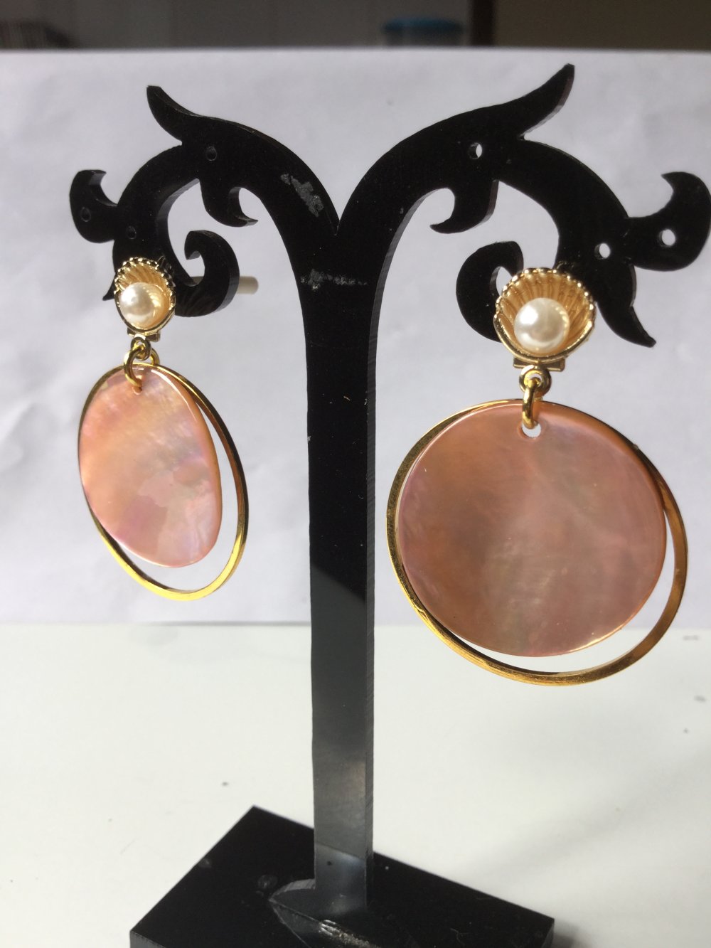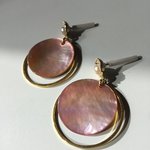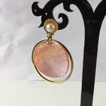 Boucles d'oreilles, très légères, composées d'un clou d'oreille doré à l'or fin en forme de petit coquillage avec perle blanche nacrée à l'intérieur sous lequel se balancent un fin anneau de 3 cm en métal doré et un grand sequin rond en coquillage naturel nacré rose.