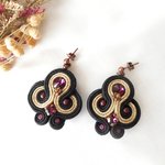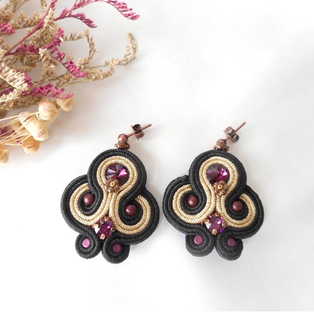 Bijoux artisanaux élégants, ces boucles d'oreilles en soutaches noire et dorée, cousu main, ornées de cristaux violets et perles en verre tchèque, sont montées sur des clous en laiton plaqué cuivre pour un look sophistiqué.