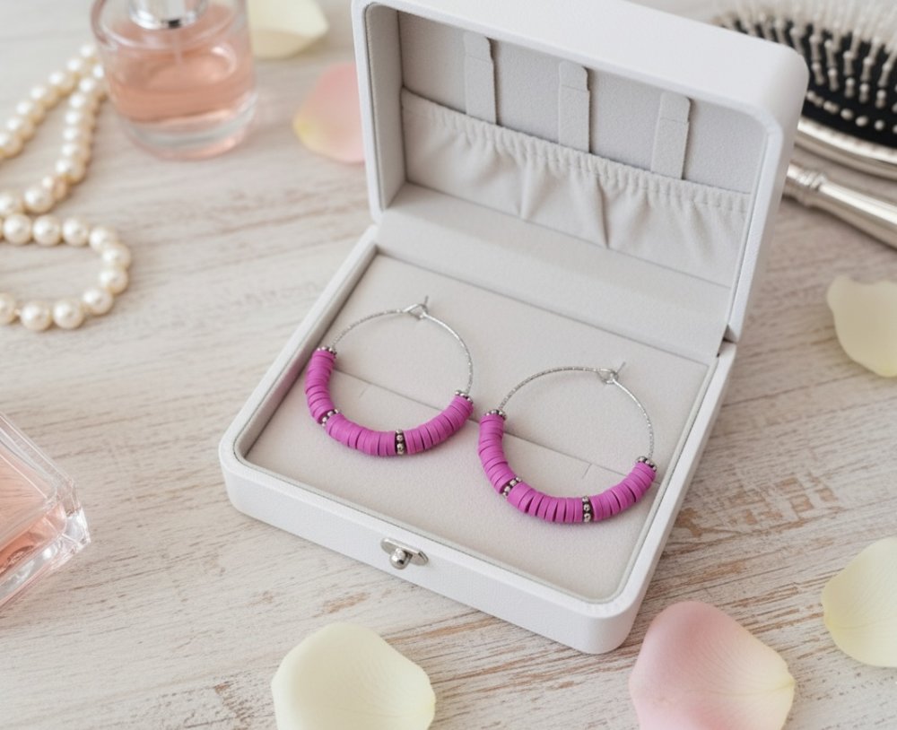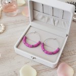Jolie paire de boucles d'oreilles créoles 30 mm en acier inoxydable ciselé et brillante avec perles Heishi de couleur violet clair
