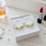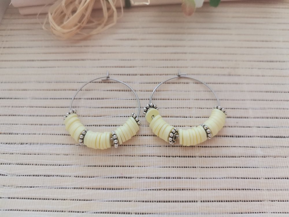 Jolie paire de boucles d'oreilles créoles en acier inoxydable de 30 mm de diamètre, perles métal intercalaire fleurs et perles Heishi 6 mm de couleur jaune pale
