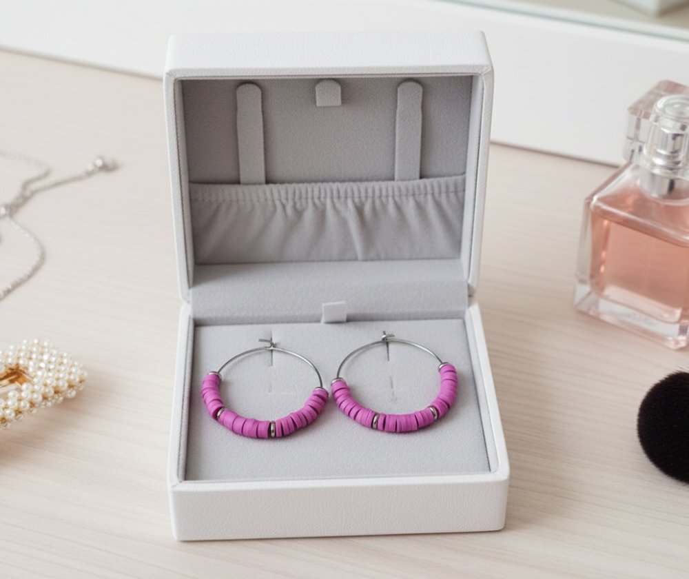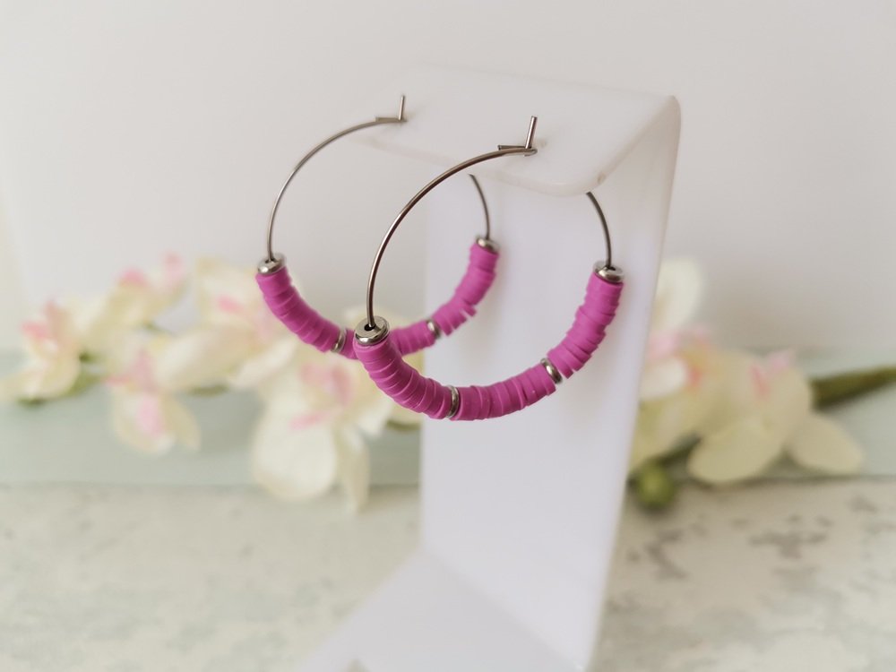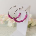 Jolie paire de boucles d'oreilles créoles en acier inoxydable de 30 mm de diamètre, perles rondelles acier inoxydable et perles Heishi de couleur violet prune