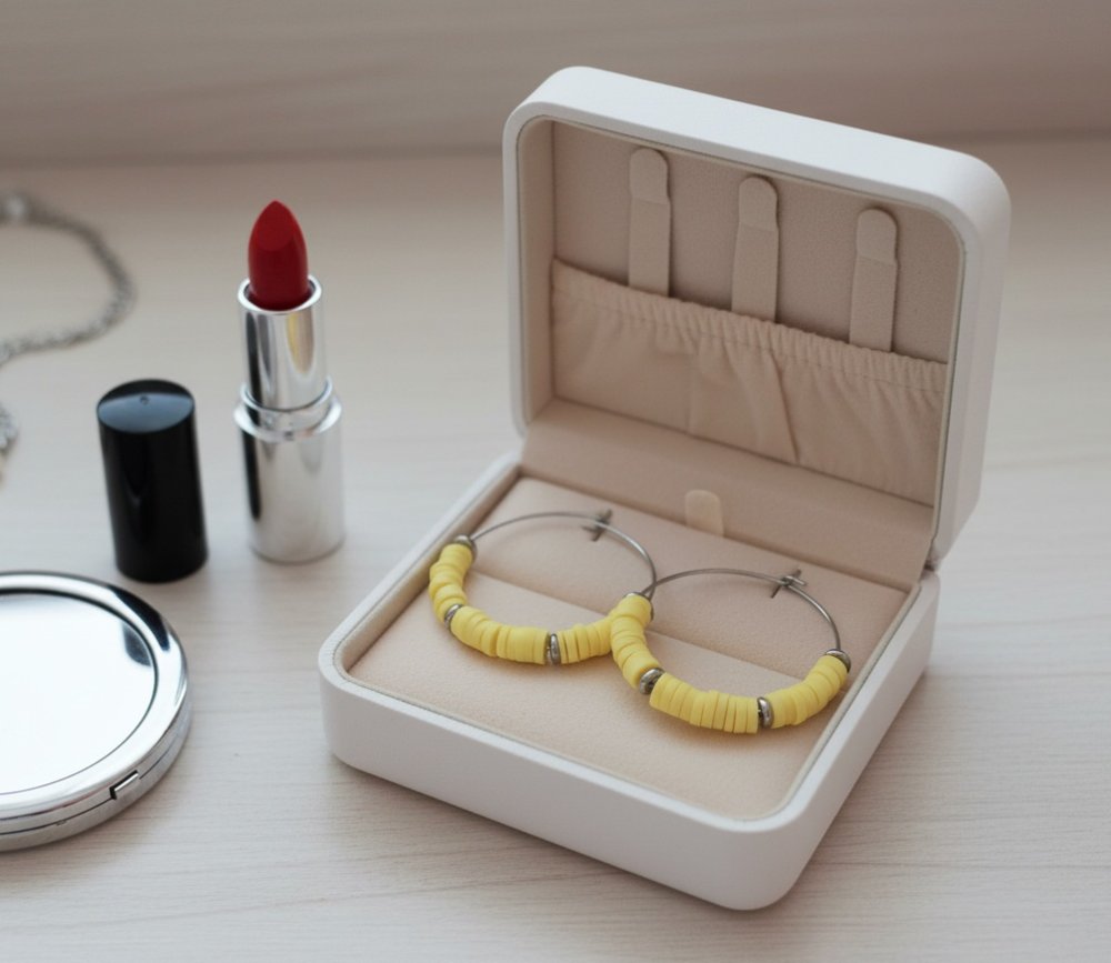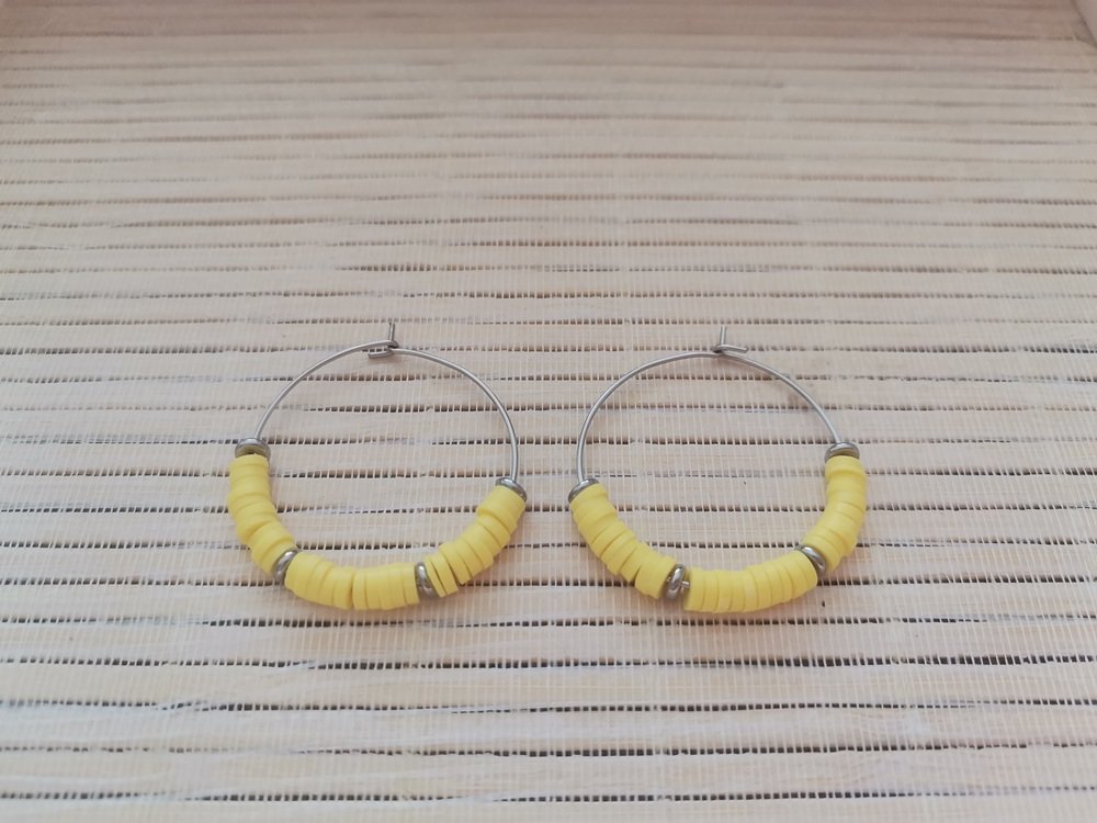 Jolie paire de boucles d'oreilles créoles en acier inoxydable de 30 mm de diamètre, perles rondelles acier inoxydable et perles Heishi de couleur jaune