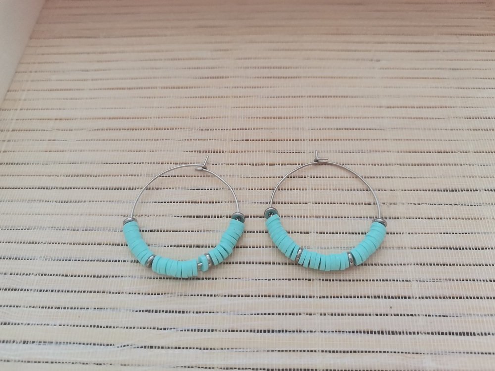 Jolie paire de boucles d'oreilles créoles en acier inoxydable de 30 mm de diamètre, perles rondelles acier inoxydable et perles Heishi de couleur vert menthe