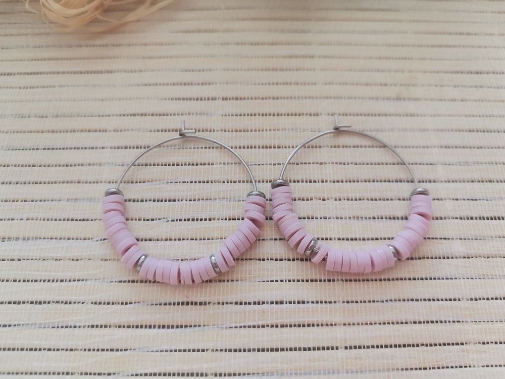 Jolie paire de boucles d'oreilles créoles en acier inoxydable de 30 mm de diamètre, perles rondelles acier inoxydable et perles Heishi de couleur vieux rose