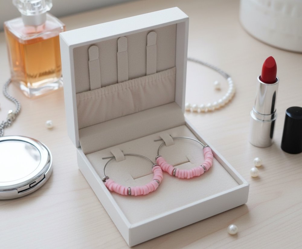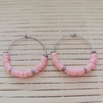 Jolie paire de boucles d'oreilles créoles en acier inoxydable de 30 mm de diamètre, perles rondelles acier inoxydable et perles Heishi de couleur rose