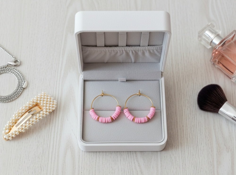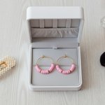 Jolie paire de boucles d'oreilles créoles dorées de 25 mm de diamètre en acier inoxydable avec perles Heishi de couleur rose clair