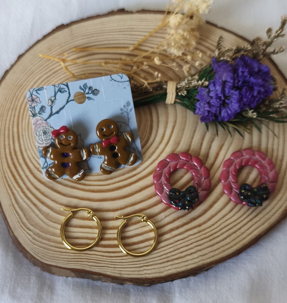 Nous avons une paire de boucles d'oreilles petits bonhommes pain d'épices,une paire de créoles doré en acier inoxydable et une paire de pampilles