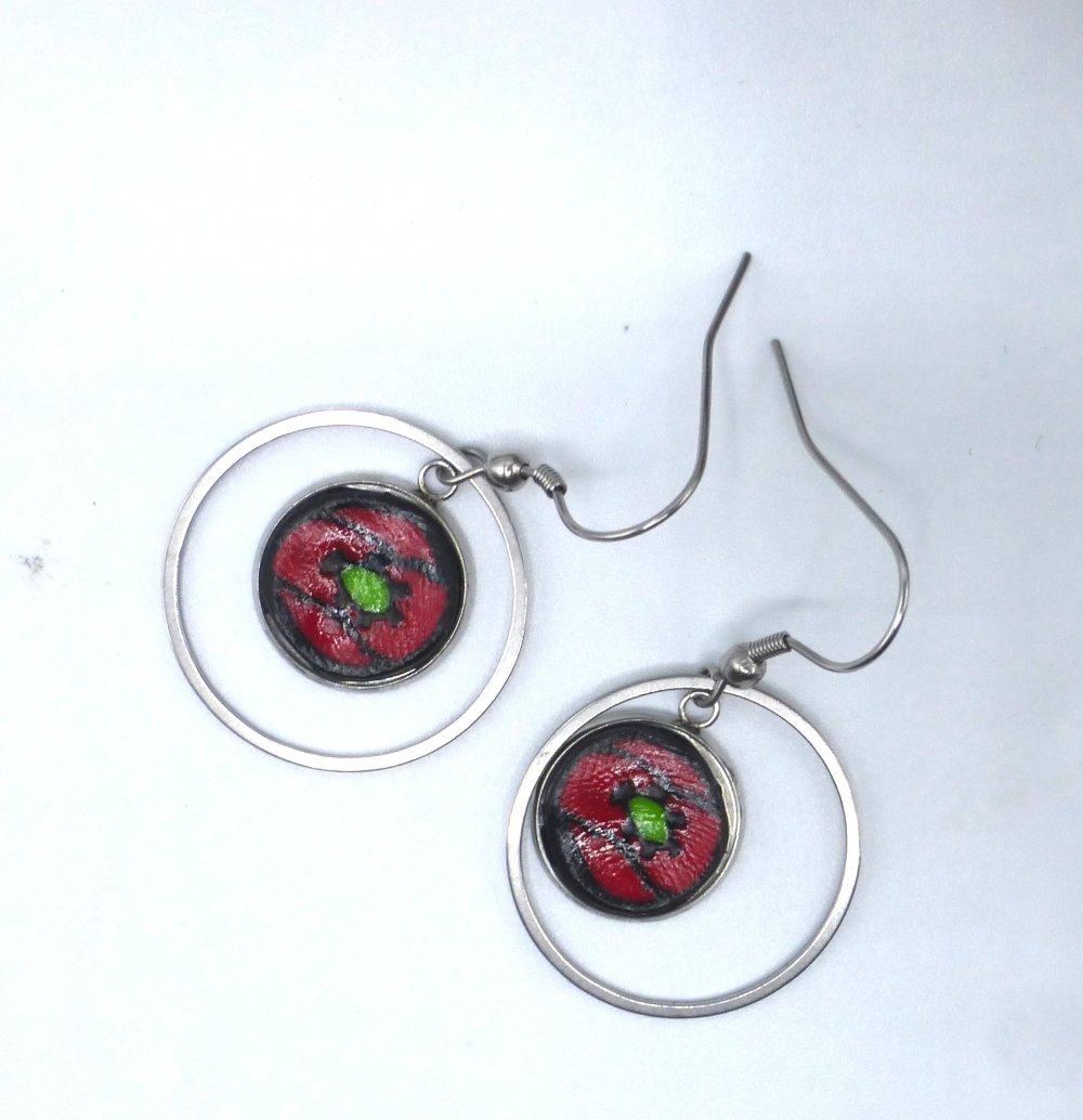 boucles d'oreilles créoles fleur coquelicot rouge noir en pâte polymère et acier inoxydable