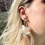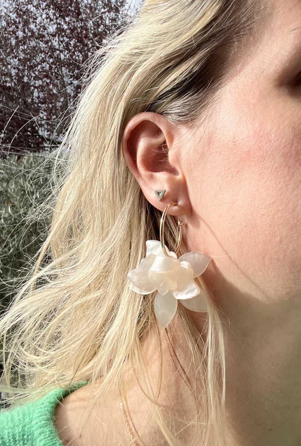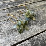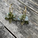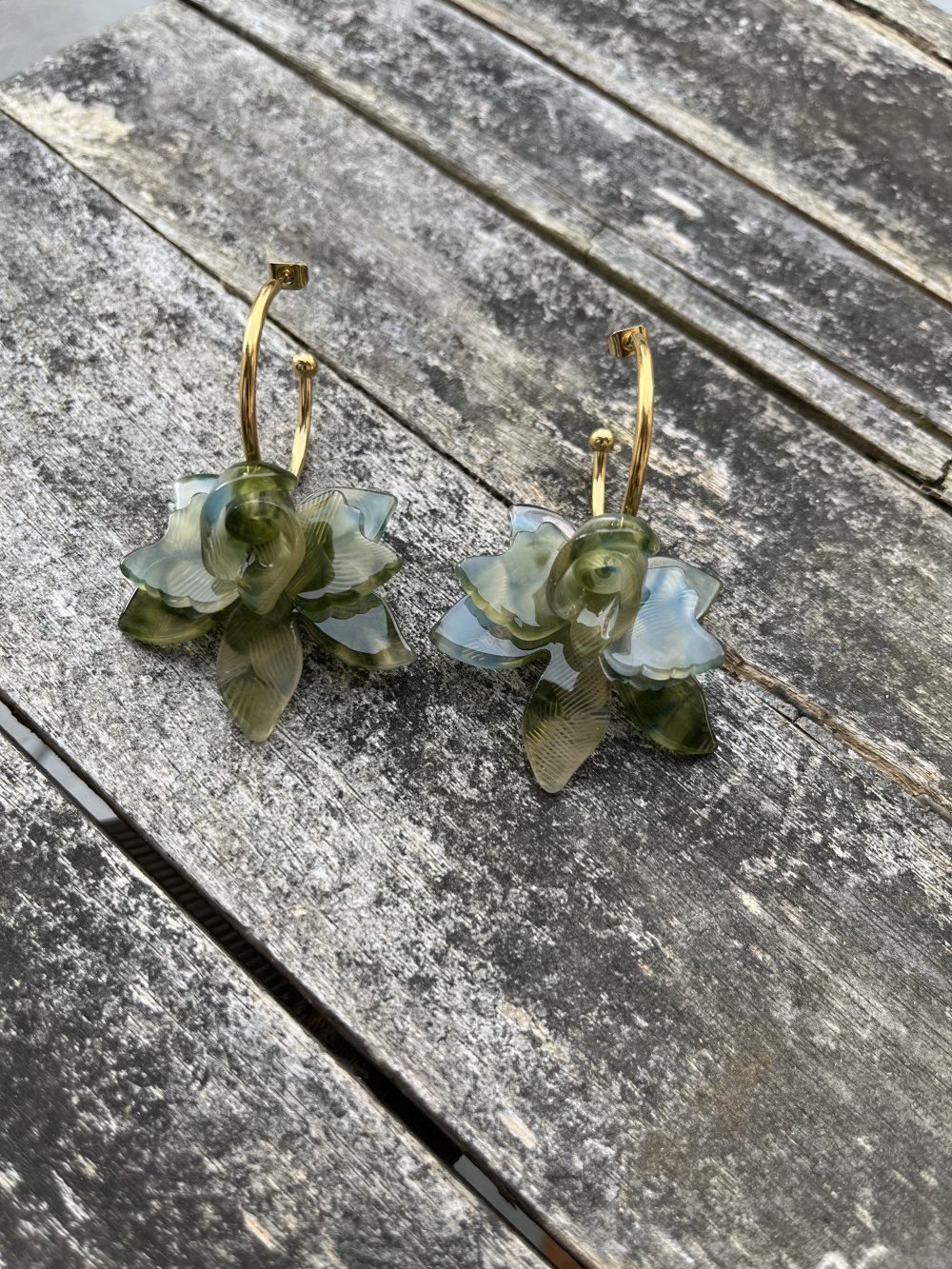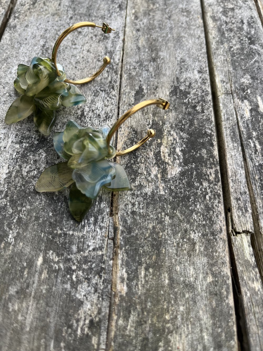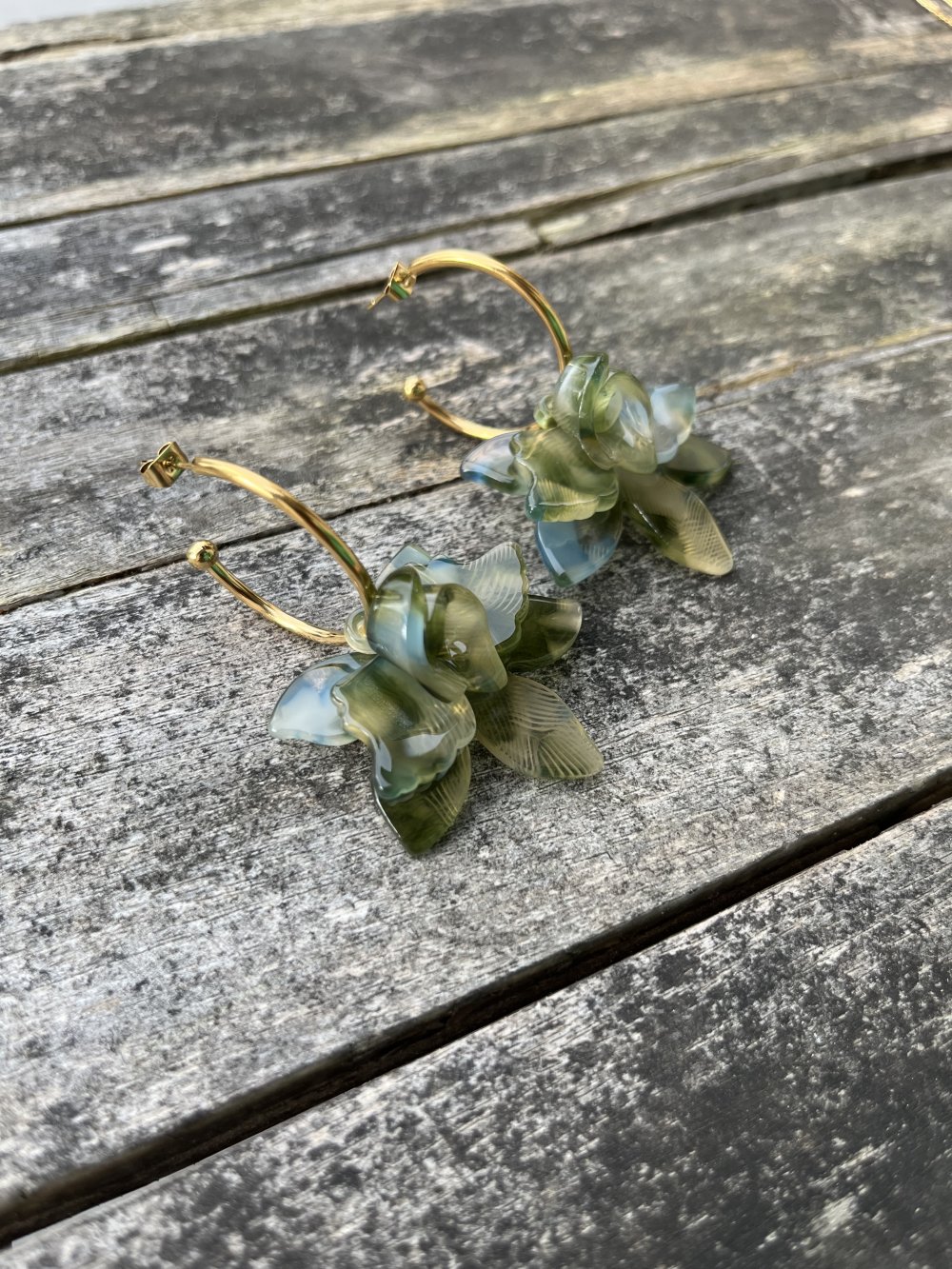 Boucles d’oreilles créoles en acier inoxydable doré avec fleurs couleur vert marbré.