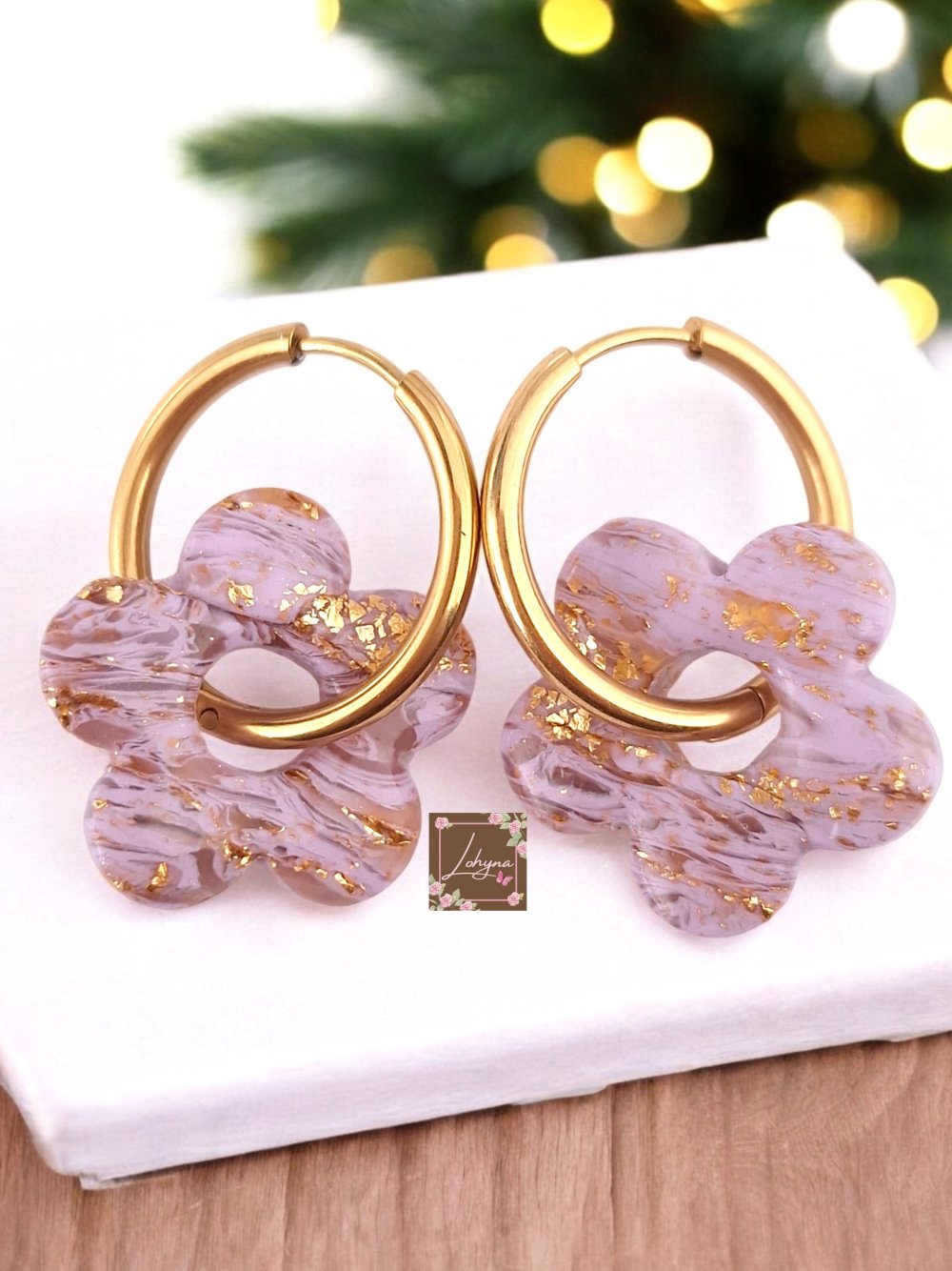 Pampilles: Chaque pampille en forme de fleur (20 mm) est confectionnée à la main en pâte polymère avec un effet marbré lilas avec des effets translucides, rehaussé de magnifiques éclats dorés.