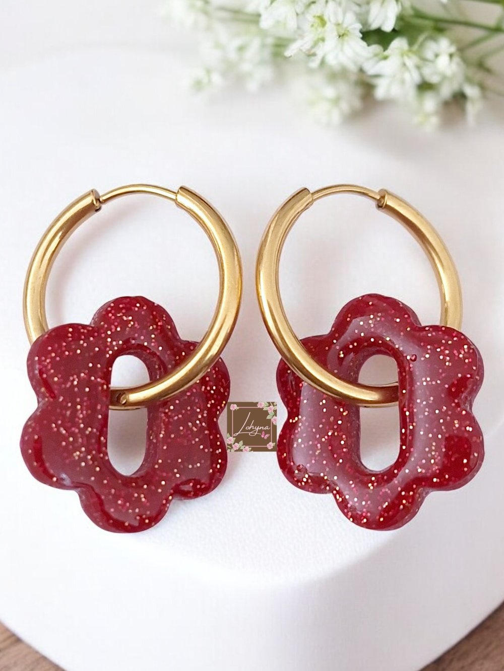 La pampille en forme de fleur (20 mm) est façonnée à la main en pâte polymère d'un beau rouge intense, rehaussé de paillettes dorées discrètes.
