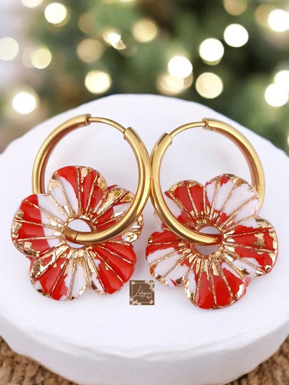 Pampilles : Réalisées à la main en pâte polymère, elles arborent un motif de fleur aux couleurs rouge vif et blanc, rehaussé de touches dorées pour un éclat festif.