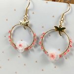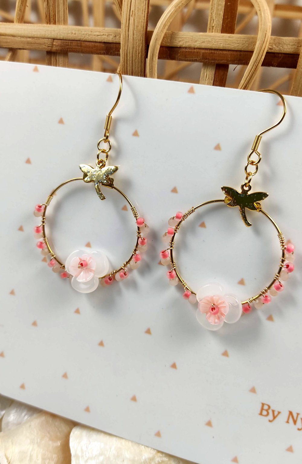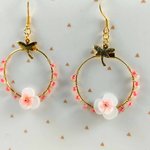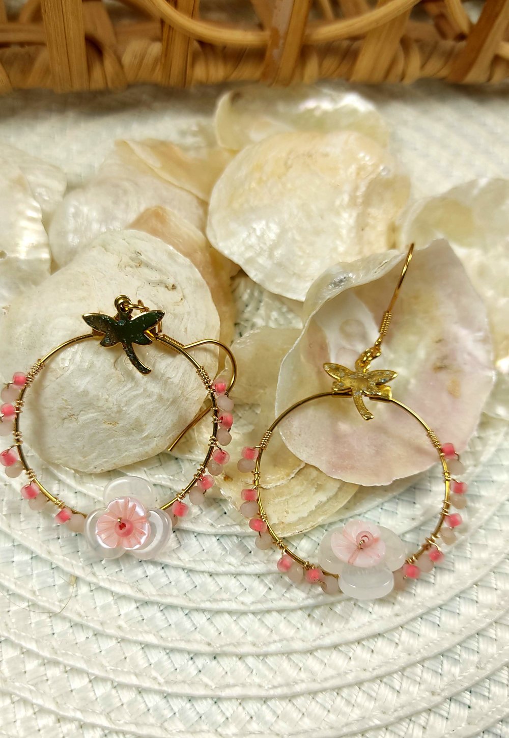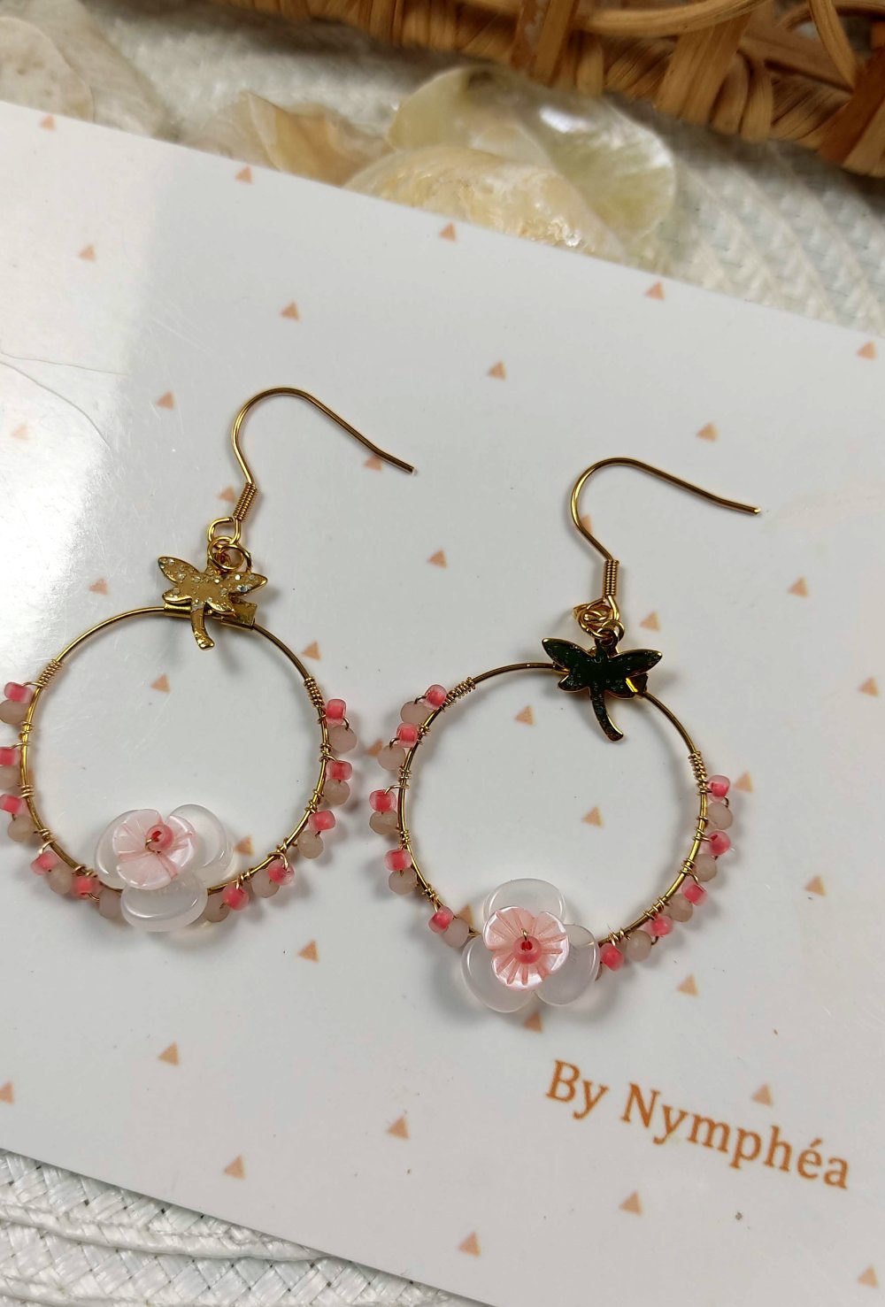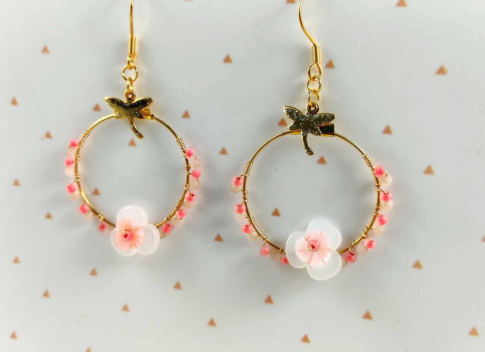 Chaque créole est ornée d’une jolie fleur centrale en perles en nacre et transparente, couleur rose, de petites perles délicates et d’une brelqoue libellule dorée, symbole de légèreté et de transformation.