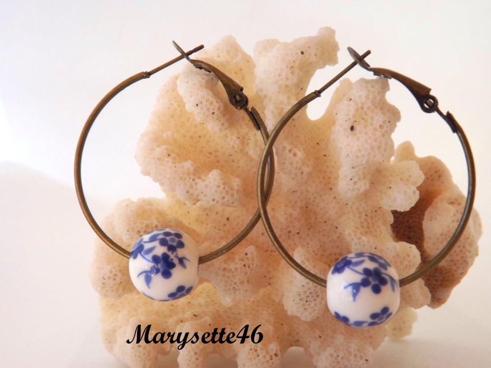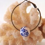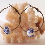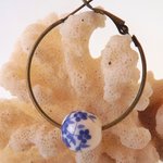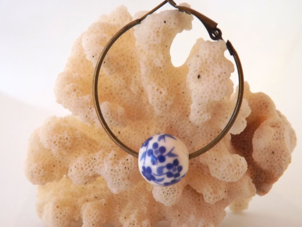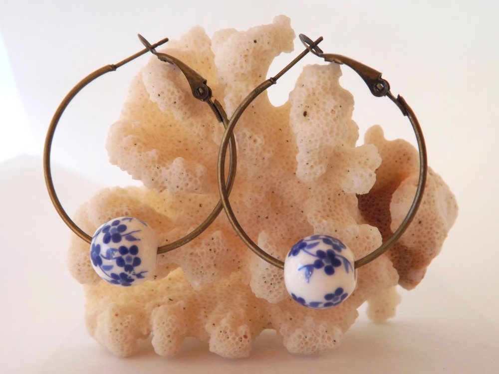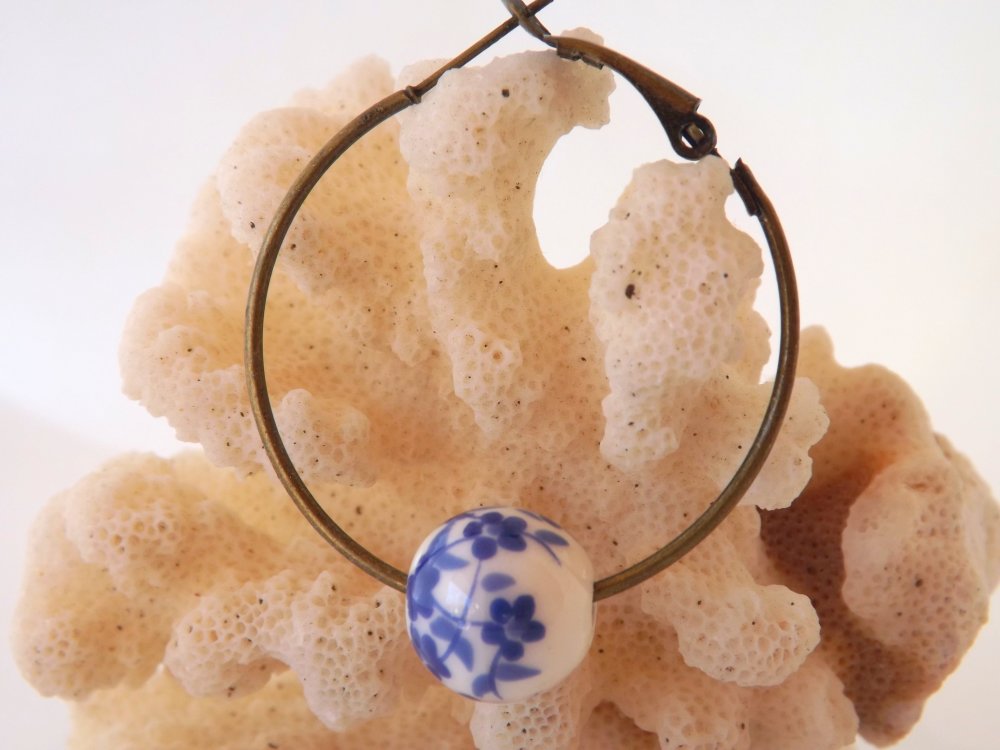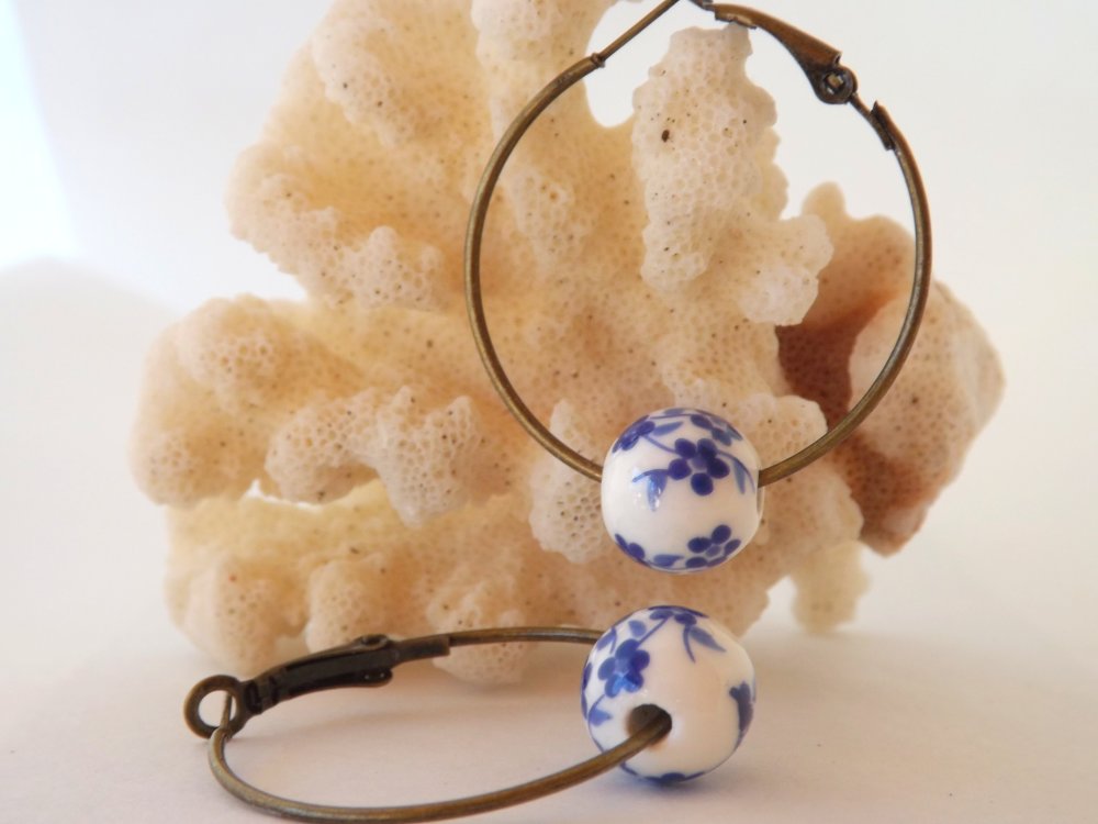Boucles d'oreilles créoles à perle en céramique blanche fleurie bleue avec apprêts en métal couleur bronze