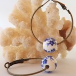 Elégantes boucles d'oreilles créoles en métal couleur bronze de 35 mm de diamètre où est insérée une perle en céramique blanche fleurie bleue de 12 mm.