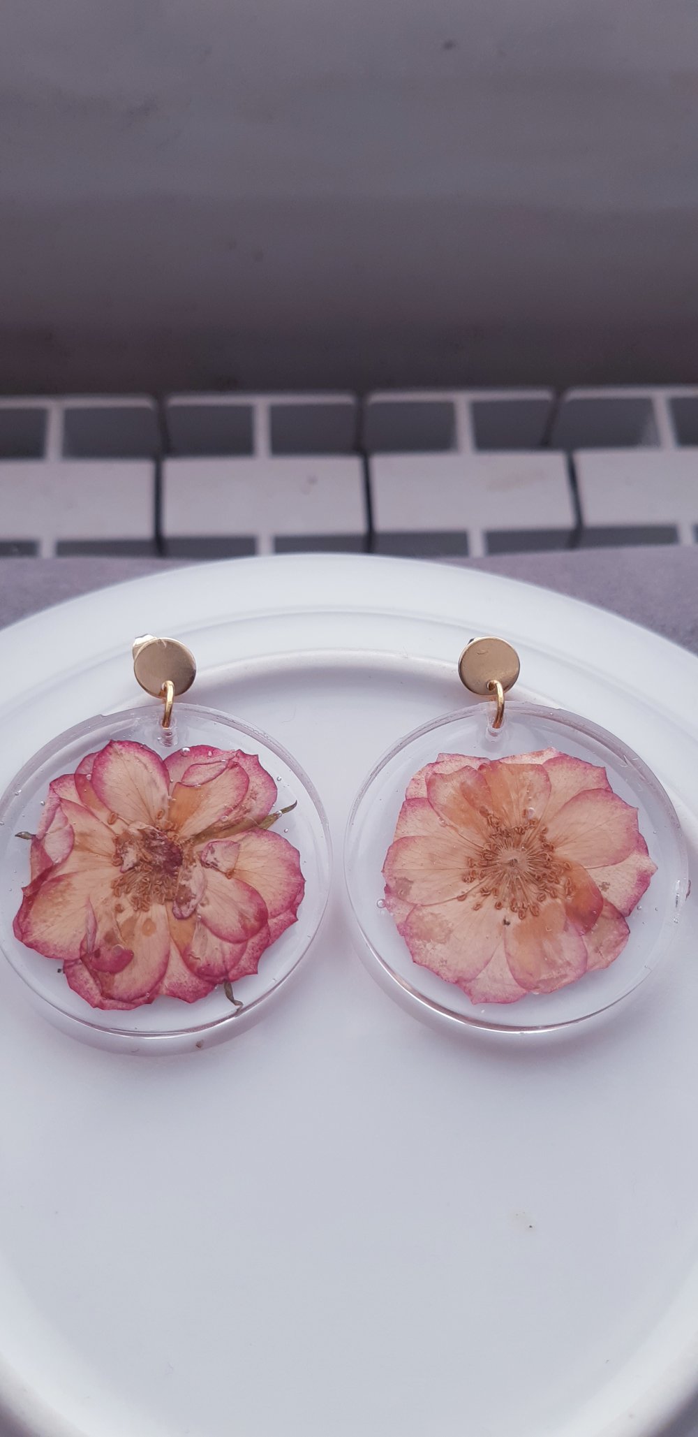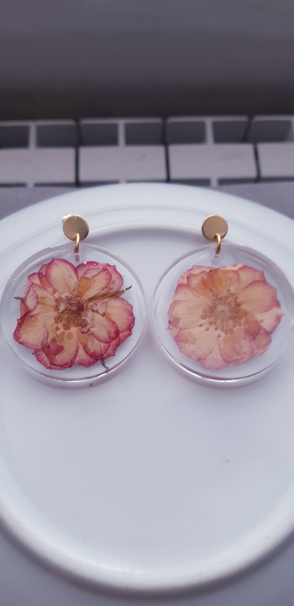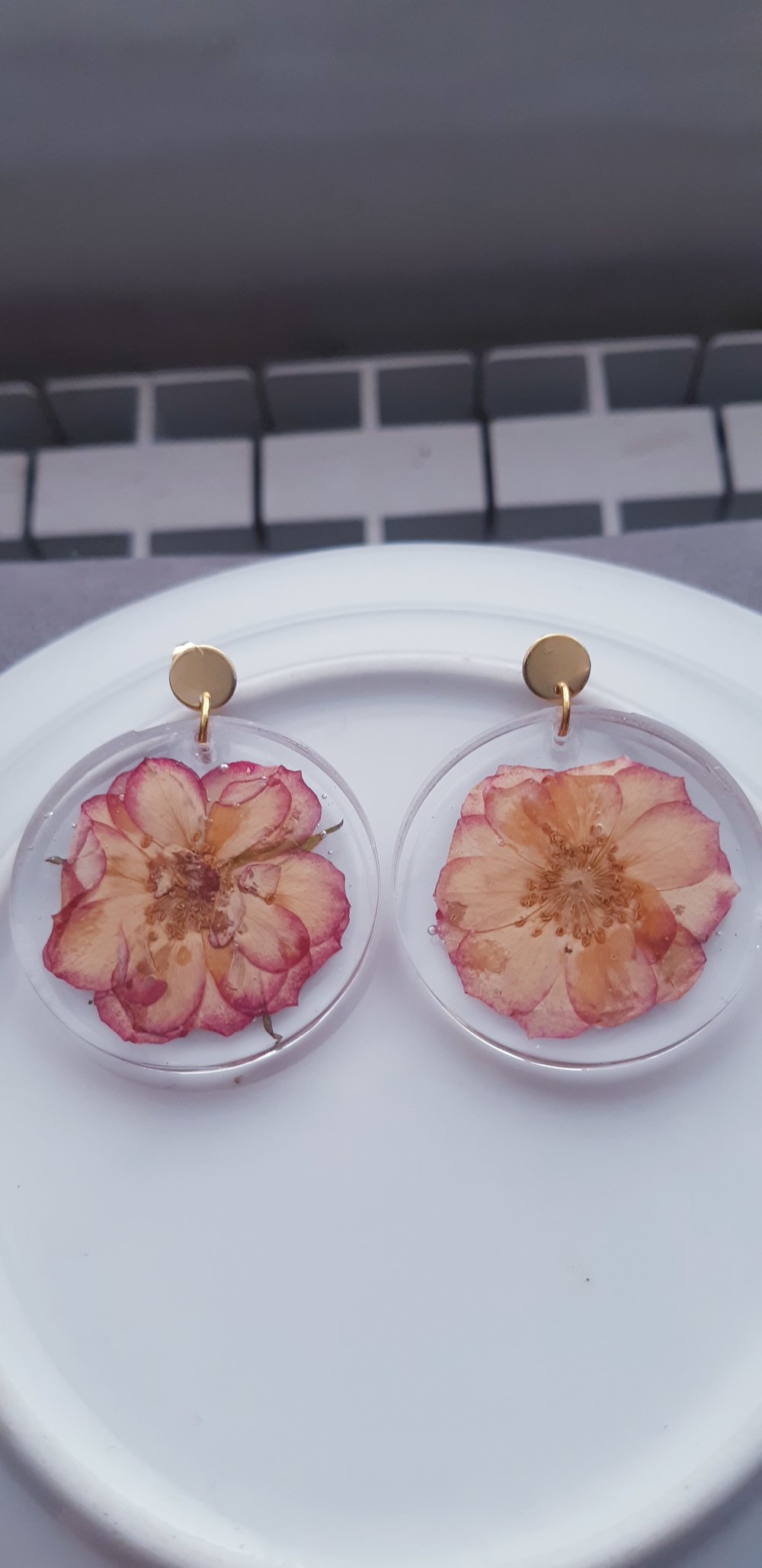 Je vous présente ces sublimes boucles d'oreilles créoles munies de sa belle grande pastille en résine uv led blanche avec ses belles fleurs séchées rouge camel vert sur ses puces or en acier inoxydable.