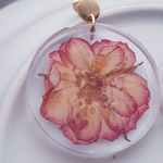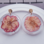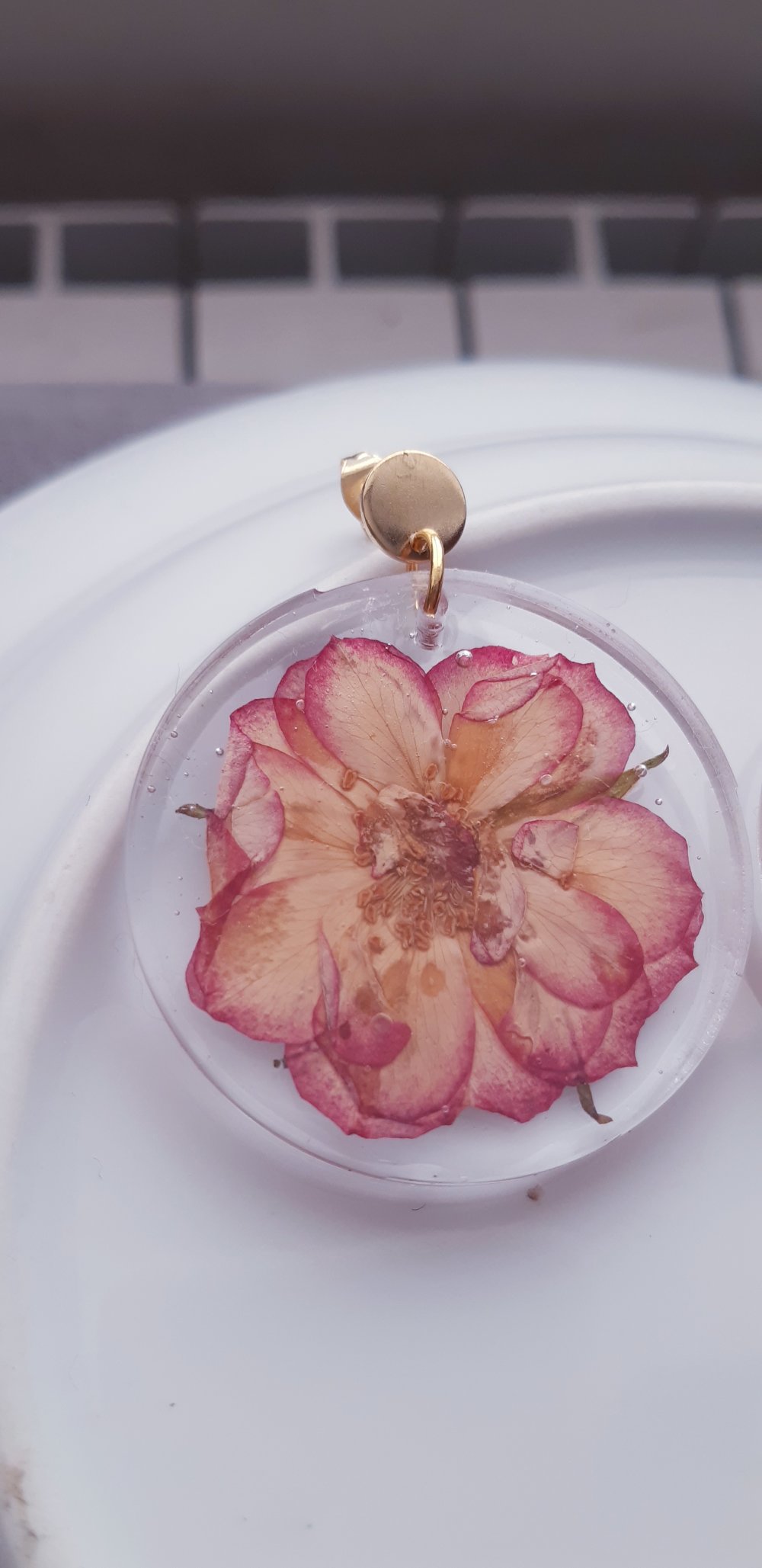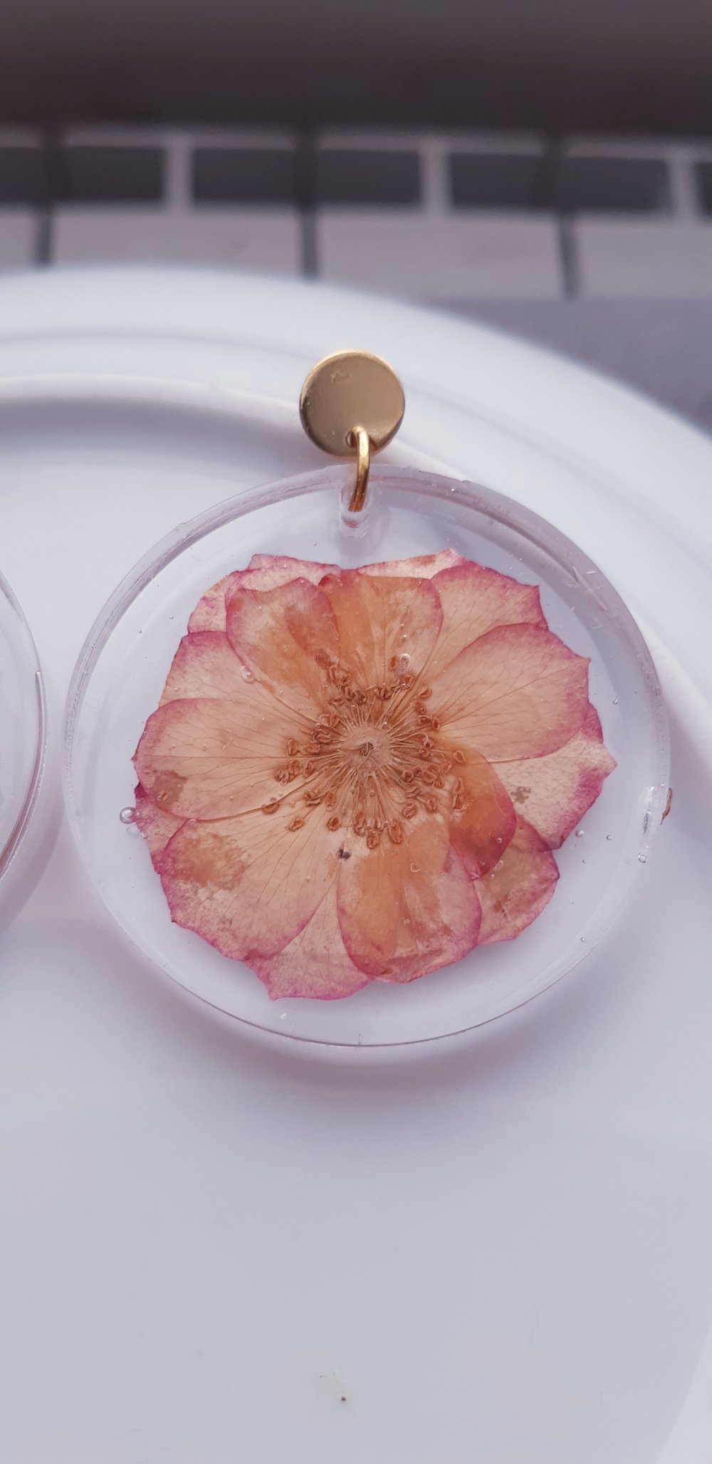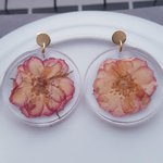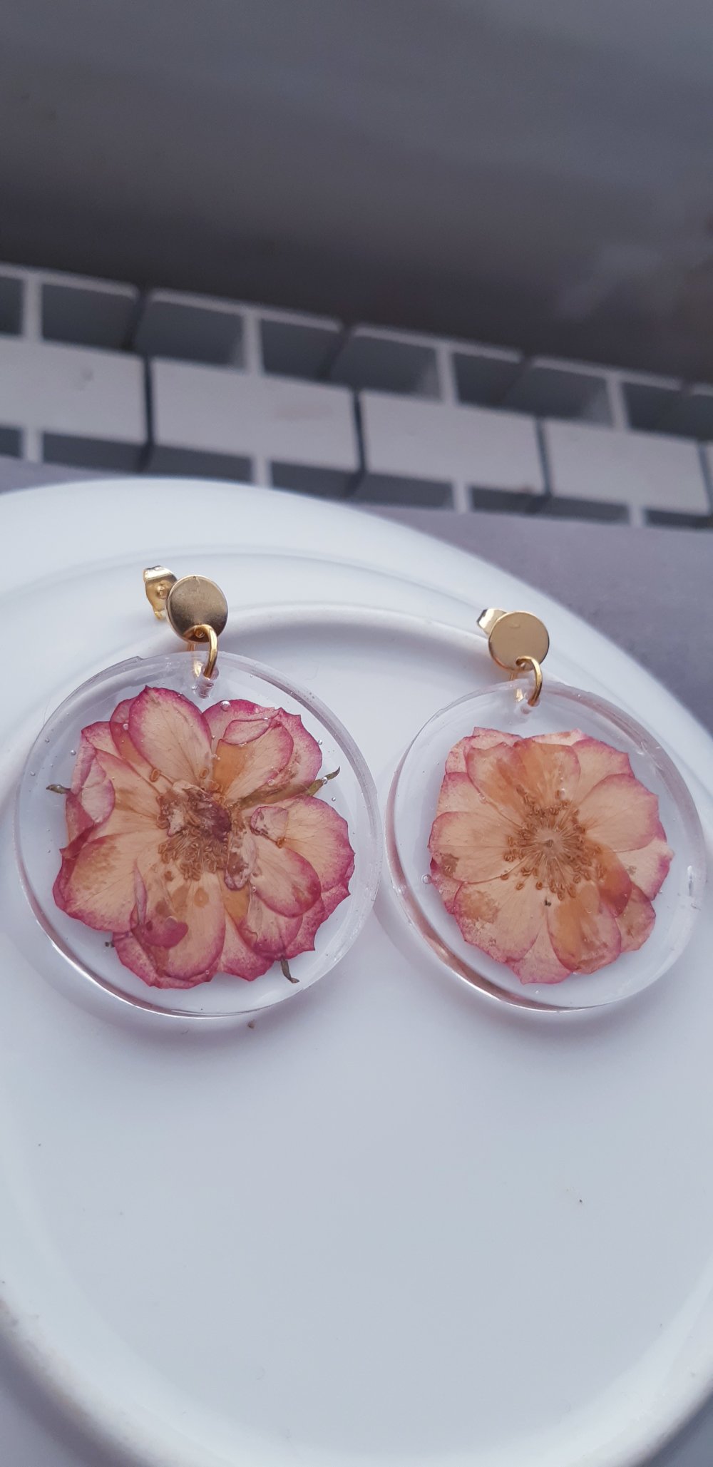 Je vous présente ces sublimes boucles d'oreilles créoles munies de sa belle grande pastille en résine uv led blanche avec ses belles fleurs séchées rouge camel vert sur ses puces or en acier inoxydable.
