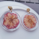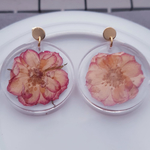 Boucles d'oreilles d'automne , grande pastille résine fleur séchée rouge camel vert blanc et puces or - Idée cadeau femme