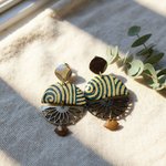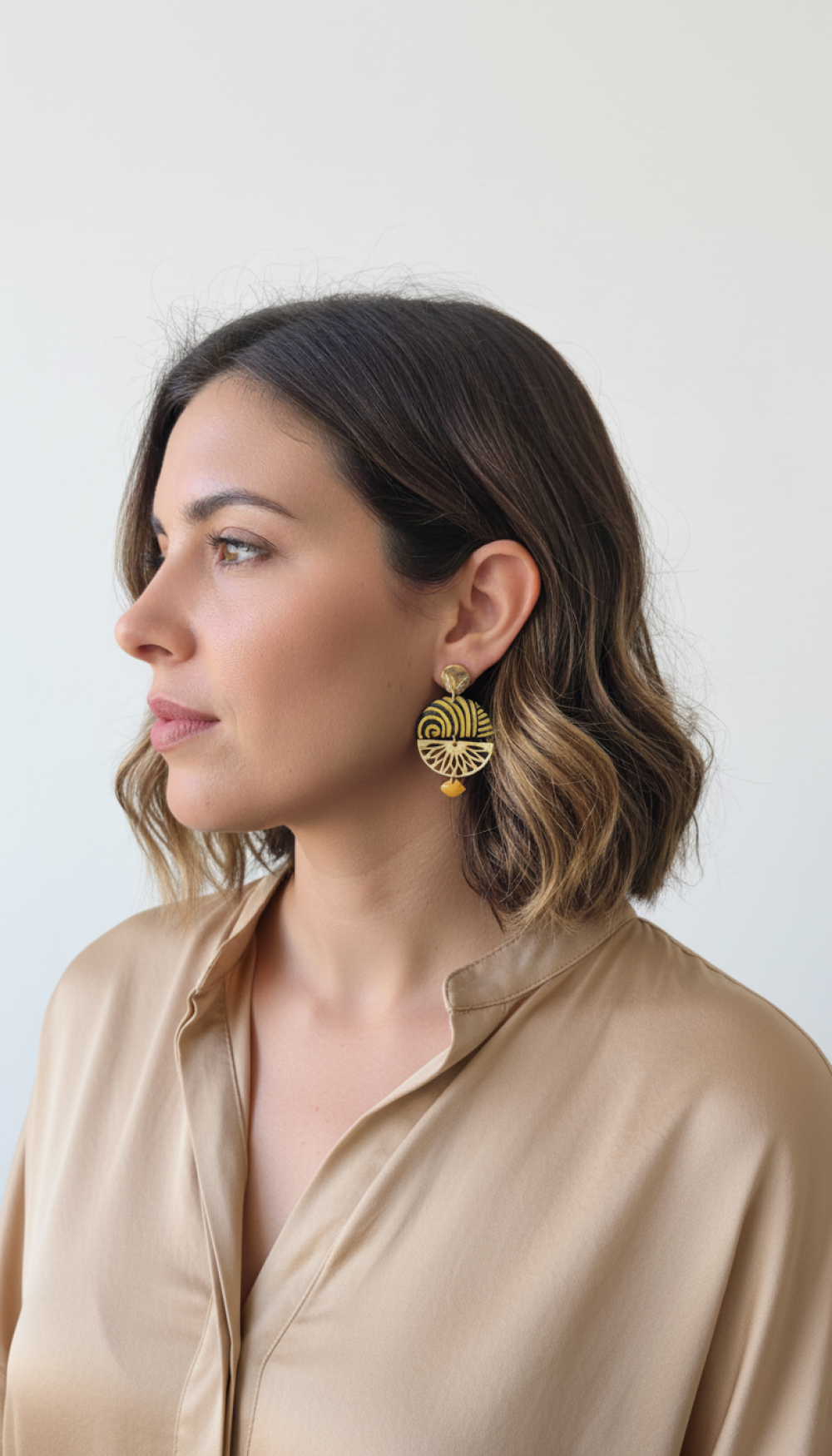 Le design associe un demi-cercle en papier à une breloque en forme d’éventail et se termine par un sequins goutte élégant, pour un mouvement léger et raffiné à chaque geste.