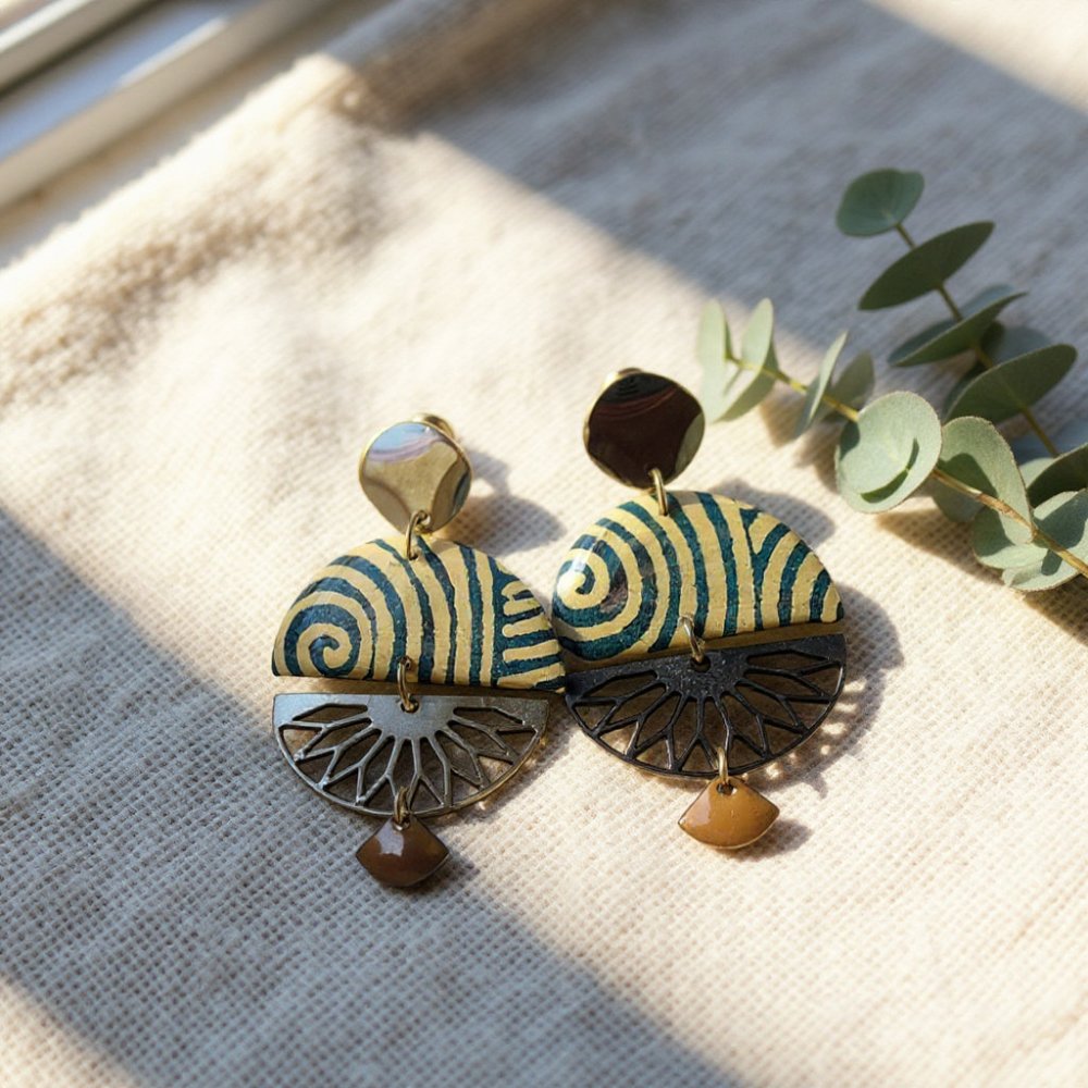 Boucles d’oreilles demi-cercles en papier népalais marron et bleu