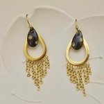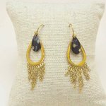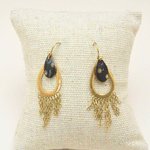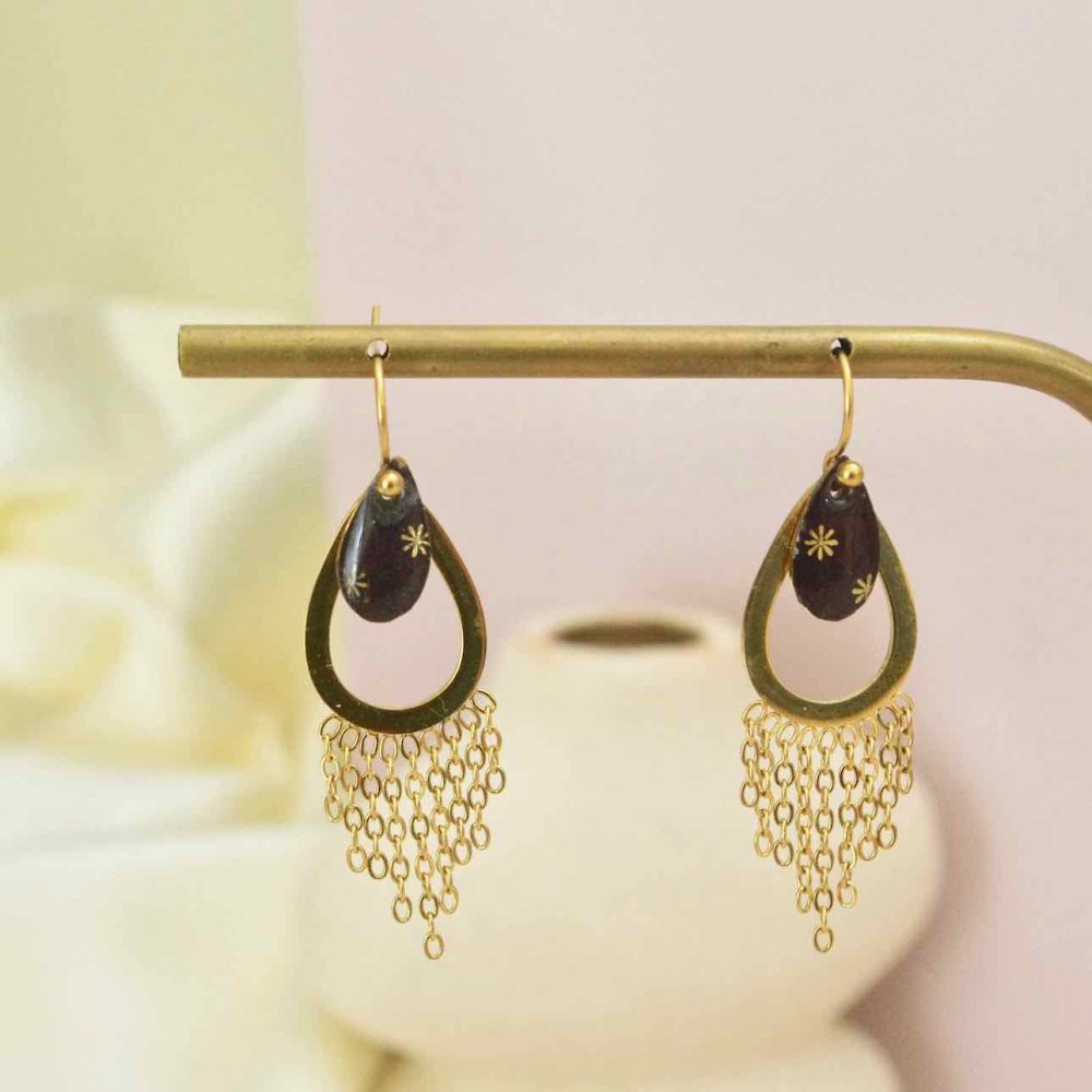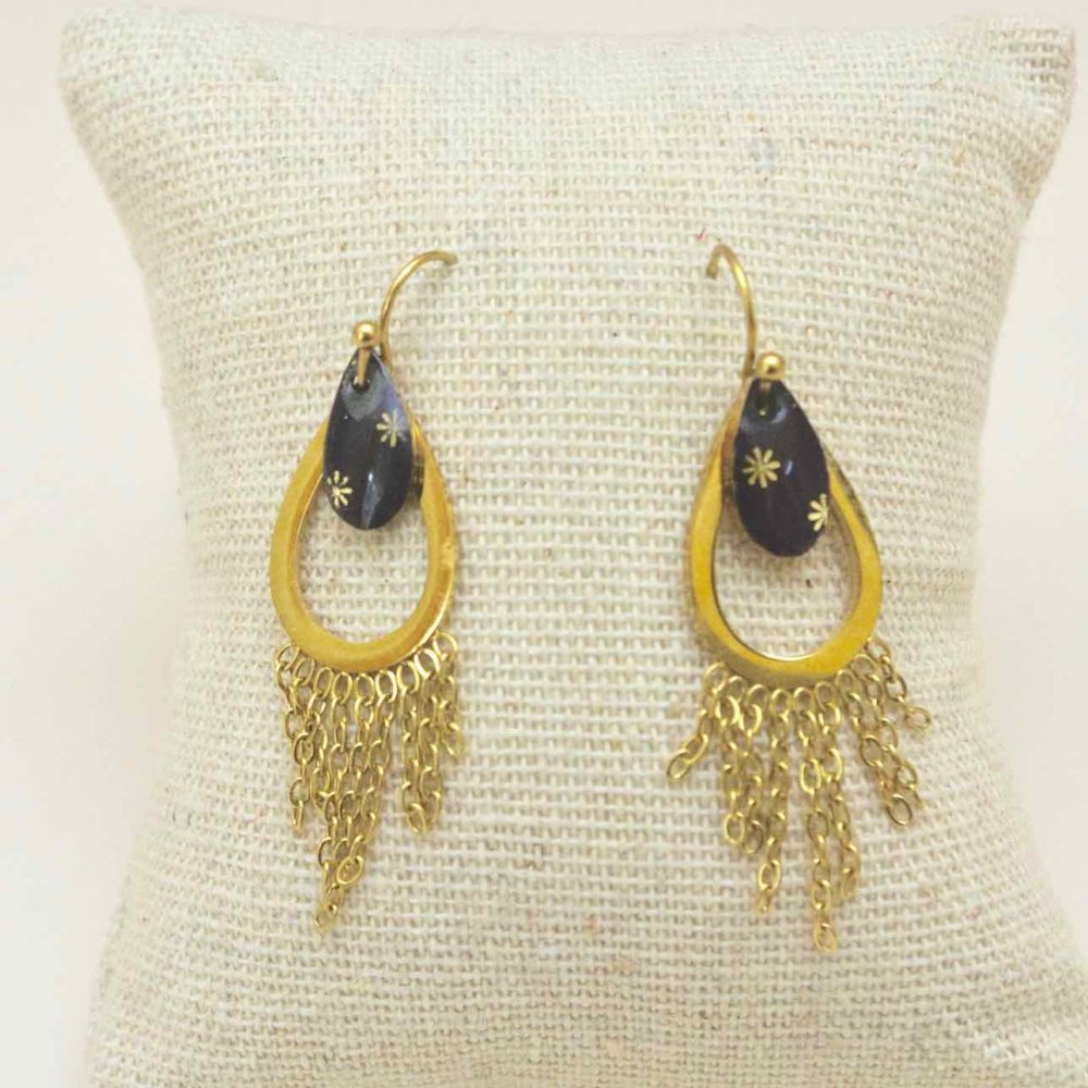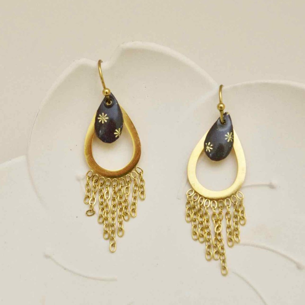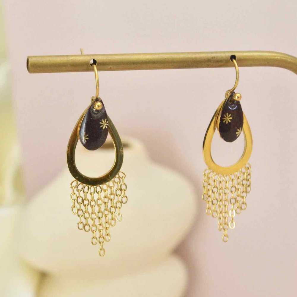 Boucles d'Oreilles Dorées Goutte Chaînes Pendantes et un médaillon recouvert de papier japonais bleu nuit et avec des petites étoiles
