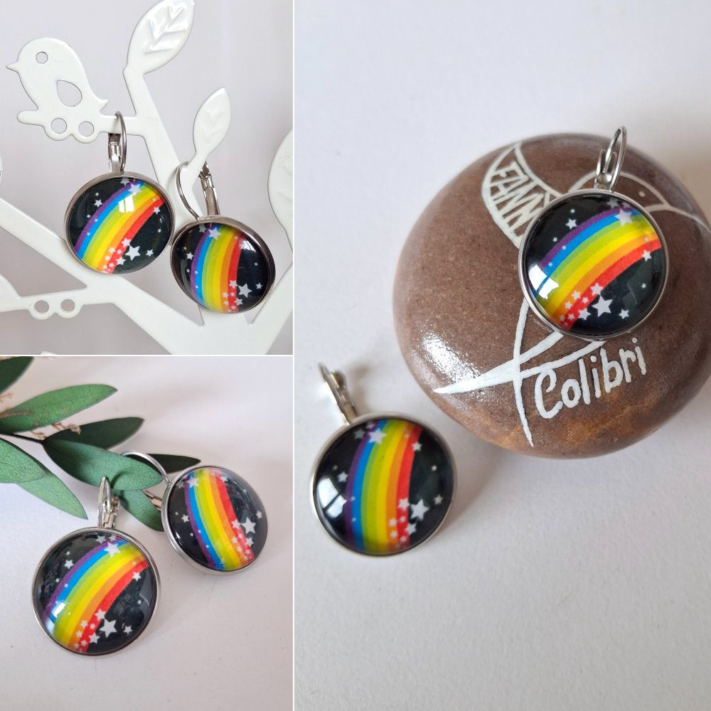Boucles d'oreilles dormeuses cabochon arc-en-ciel