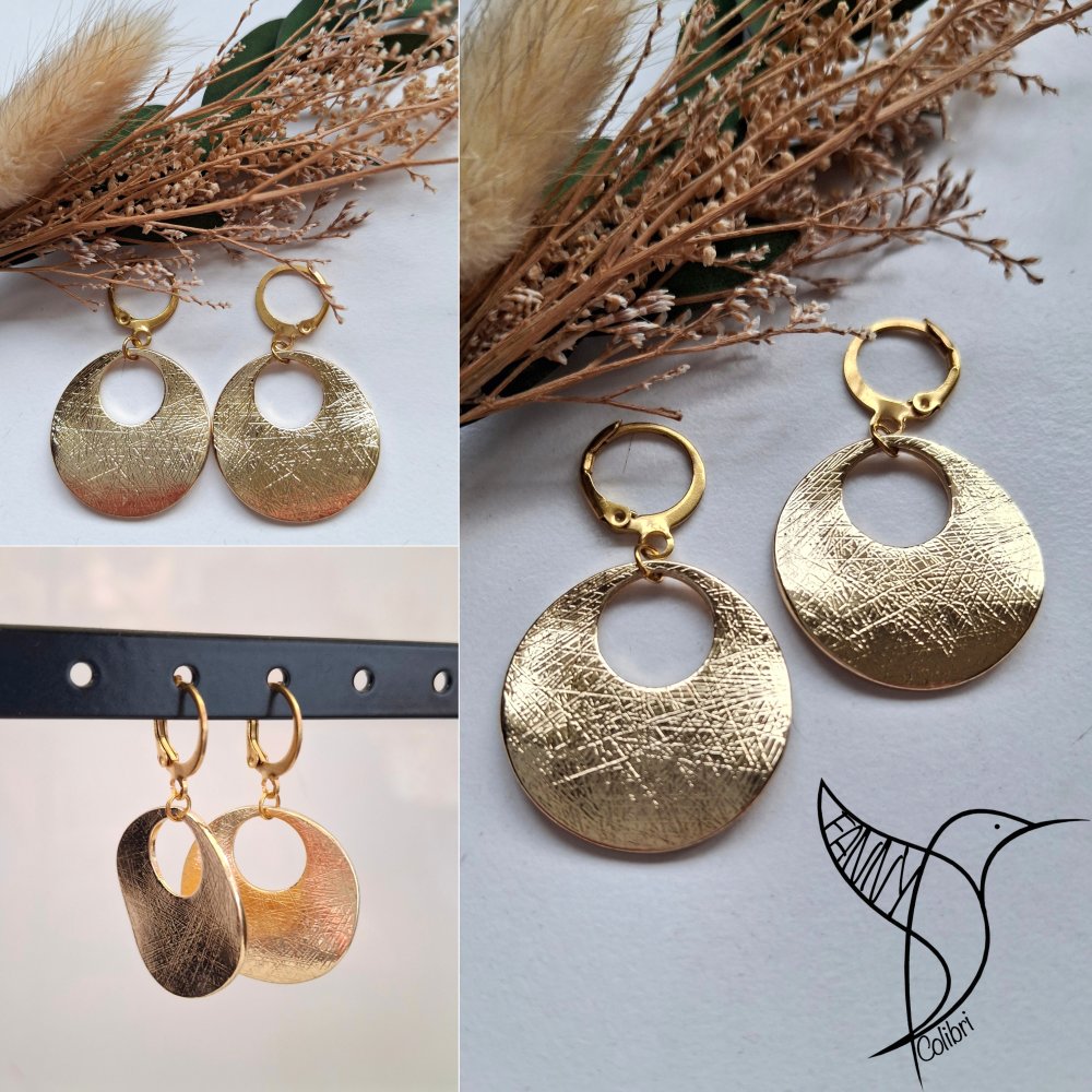 Voici une paire de boucles d'oreilles montée sur un support dormeuses en acier inoxydable doré.