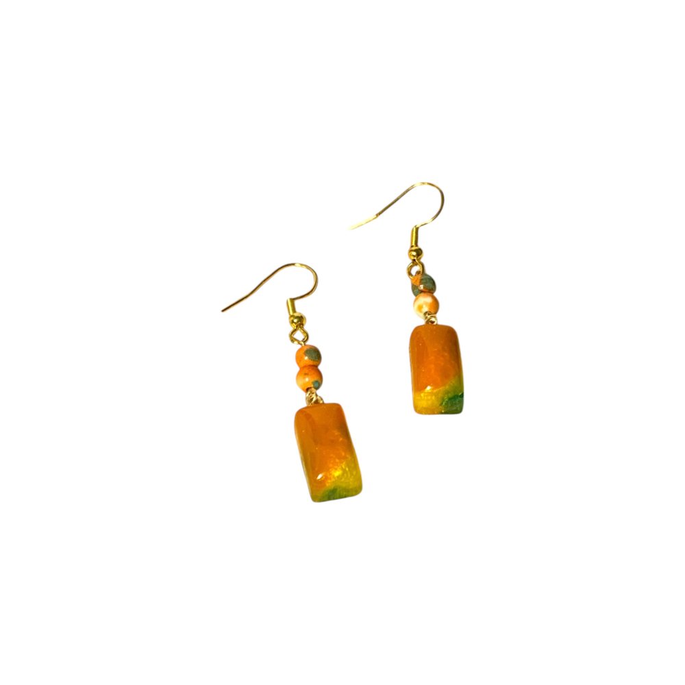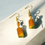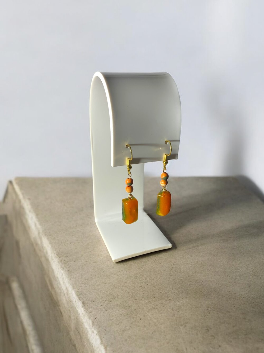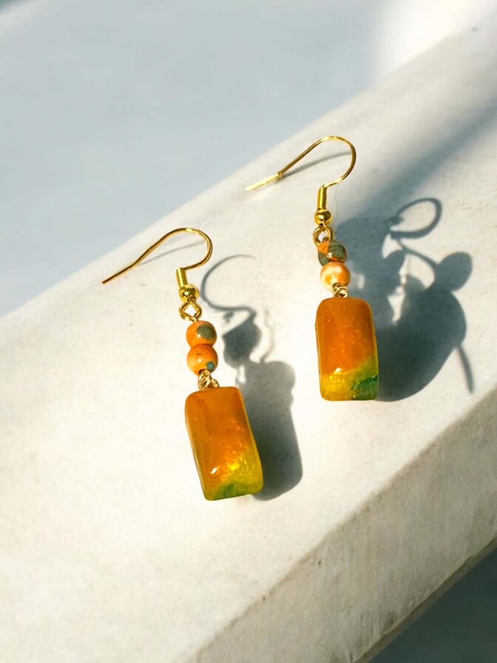 Une création inspirée par la nature : des boucles d’oreilles lumineuses, façonnées à la main, où se mêlent des nuances irisées de vert profond et d’orangé ambré. Un bijou unique, léger et élégant, à la fois naturel et raffiné.