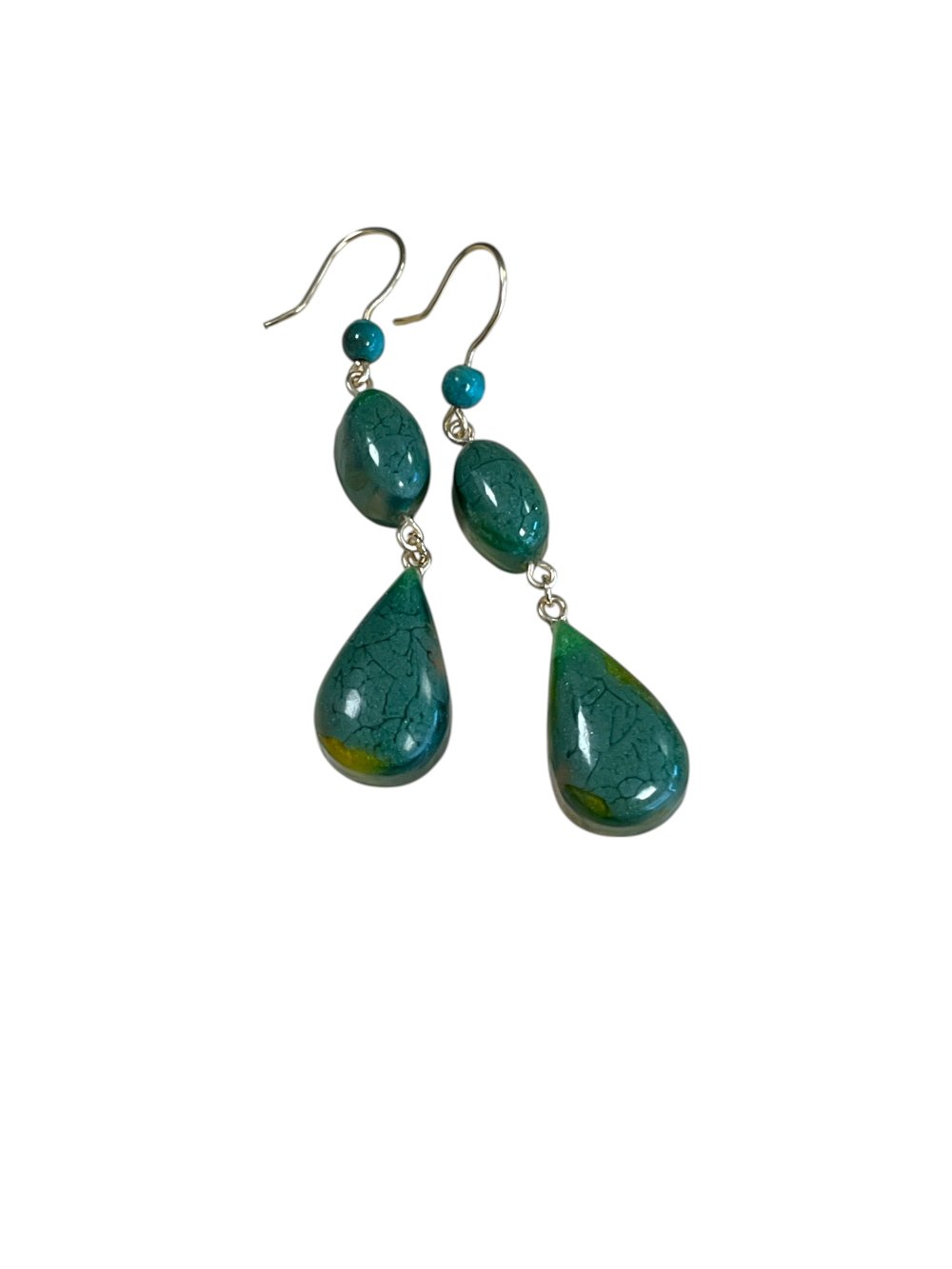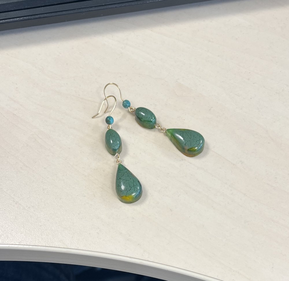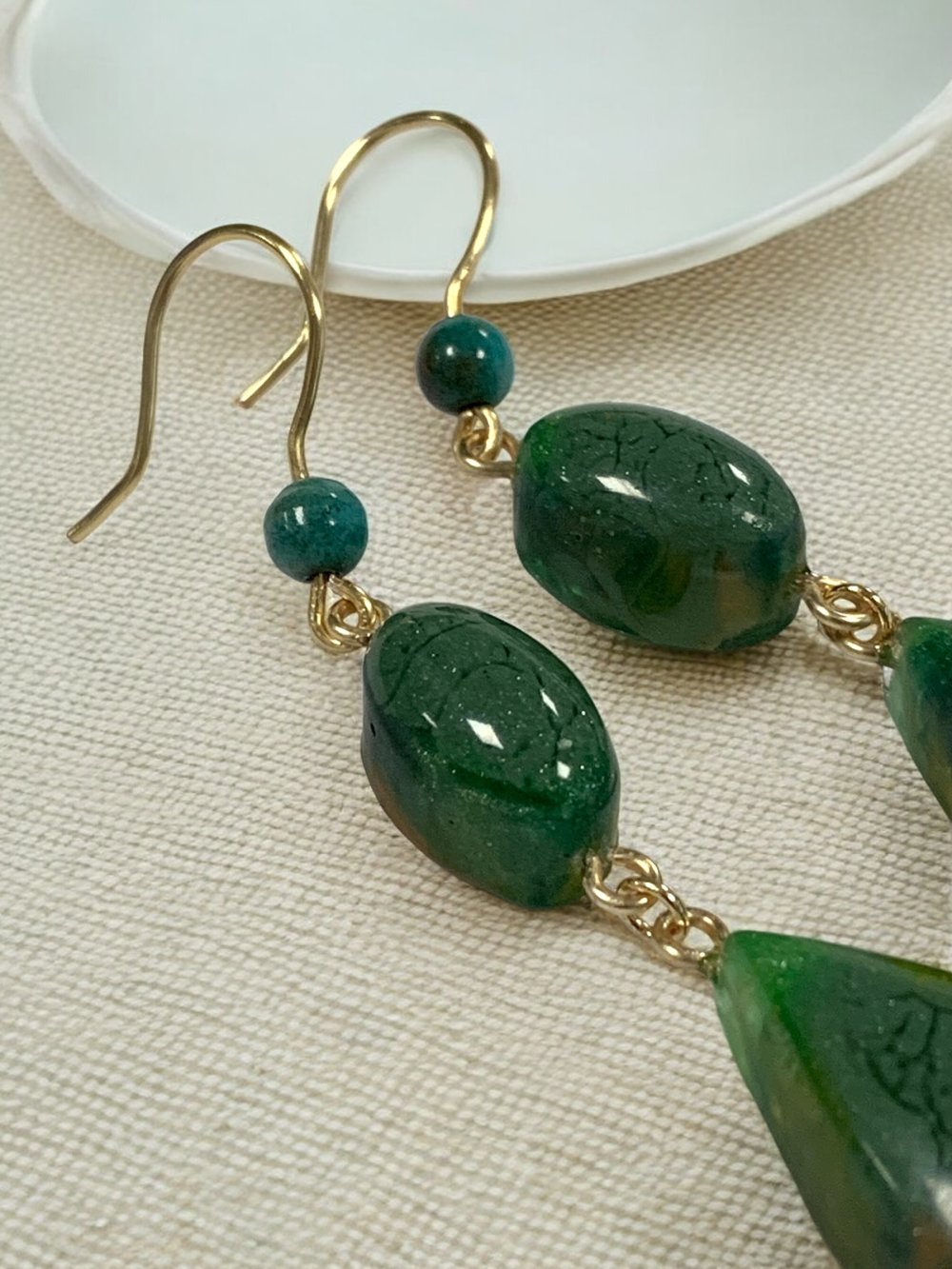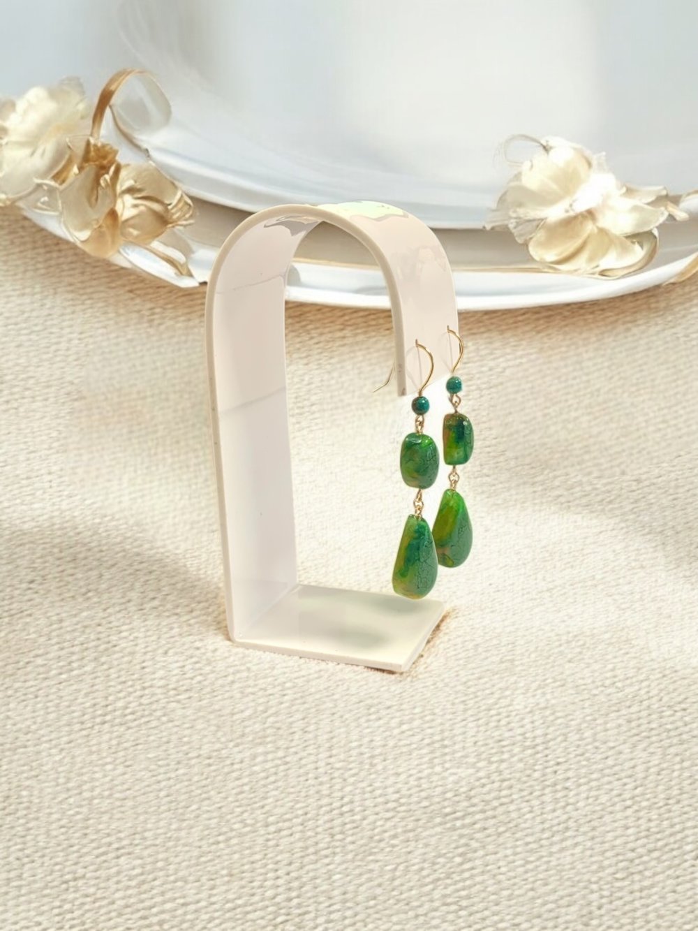Une création inspirée par la nature : des boucles d’oreilles lumineuses, façonnées à la main, où se mêlent des nuances de vert profond et d’orangé ambré. Un bijou unique, léger et élégant, à la fois naturel et raffiné.