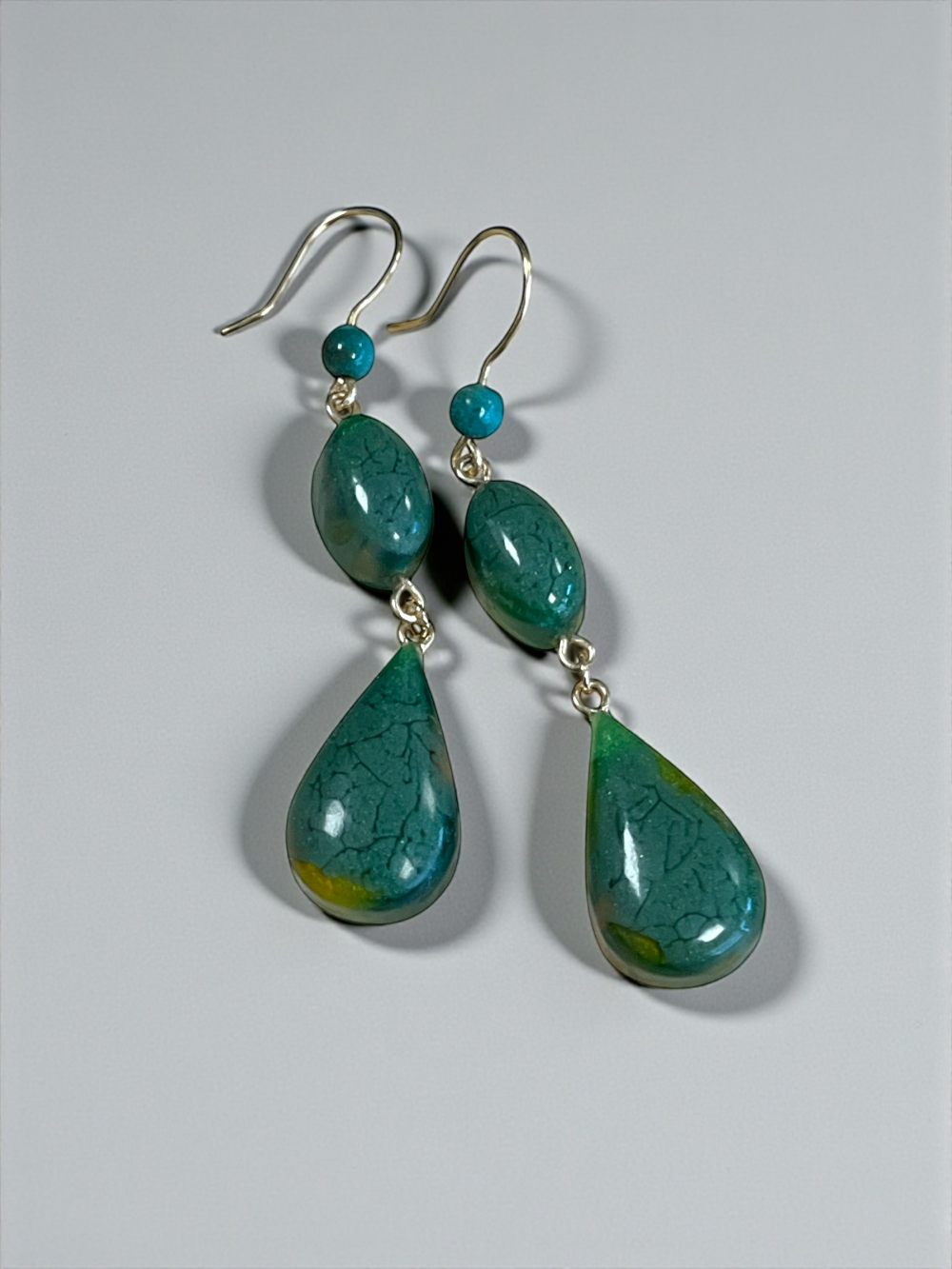 – Matériaux : Résine artisanale écologique, pigments naturels vert & ambré, montures en acier inoxydable doré (sans nickel, sans plomb, hypoallergénique)