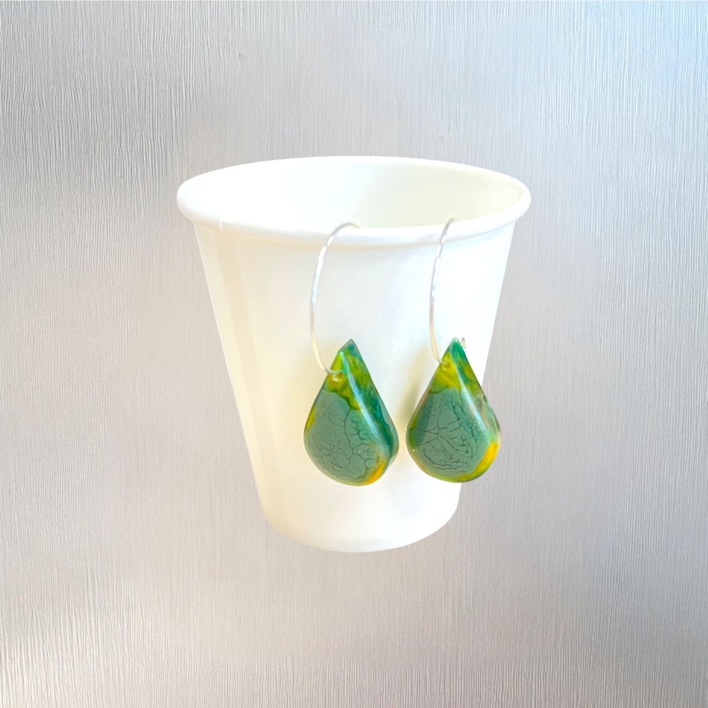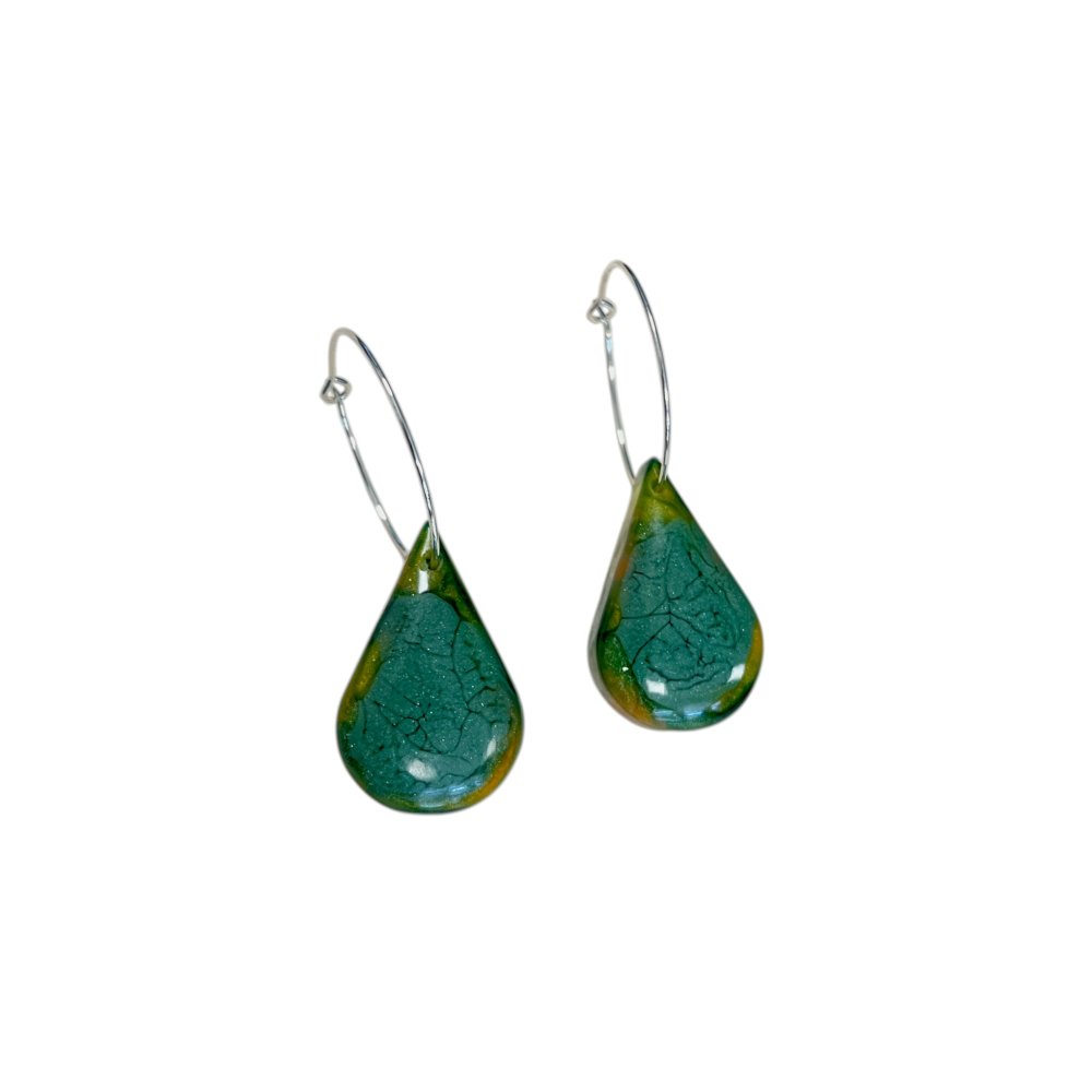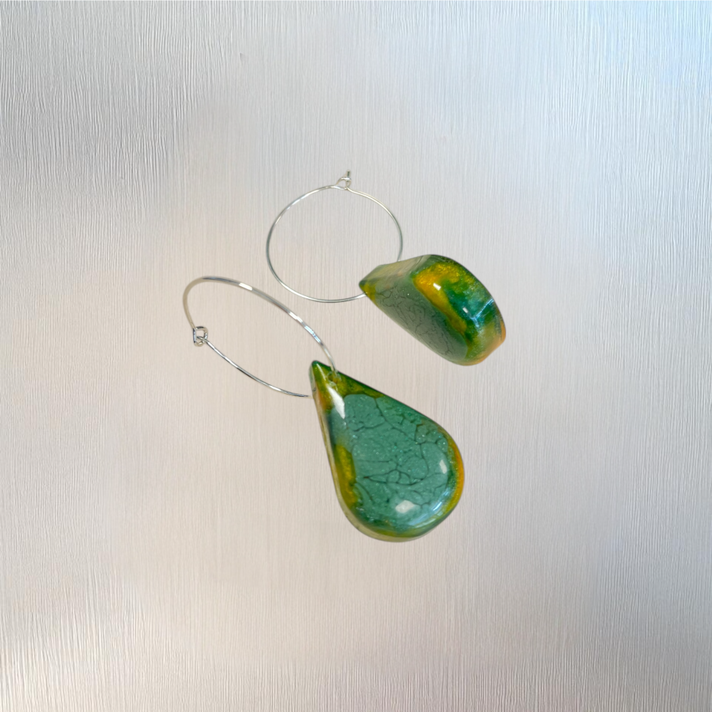 Une création inspirée par la nature : des boucles d’oreilles lumineuses, façonnées à la main, où se mêlent des nuances de vert profond et d’orangé ambré. Un bijou unique, léger et élégant, à la fois naturel et raffiné.