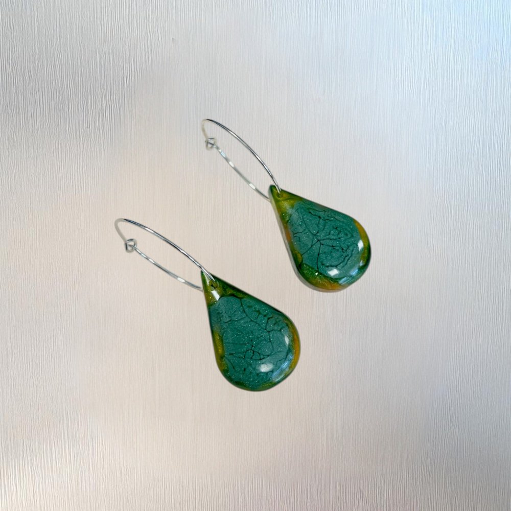– Matériaux : Résine artisanale écologique, pigments naturels vert & ambré, montures en acier inoxydable argenté (sans nickel, sans plomb, hypoallergénique)