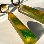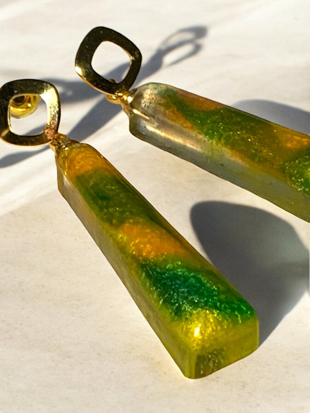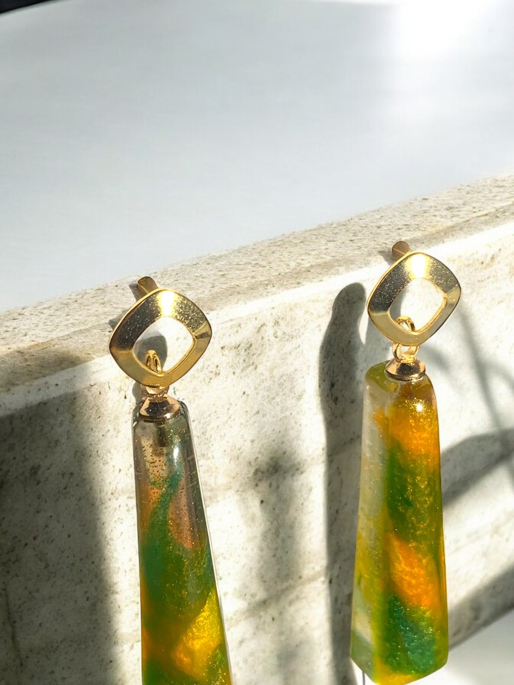 – Matériaux : Résine artisanale écologique, pigments naturels vert & ambré, montures en acier inoxydable doré (sans nickel, sans plomb, hypoallergénique)