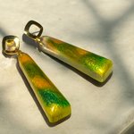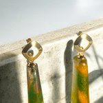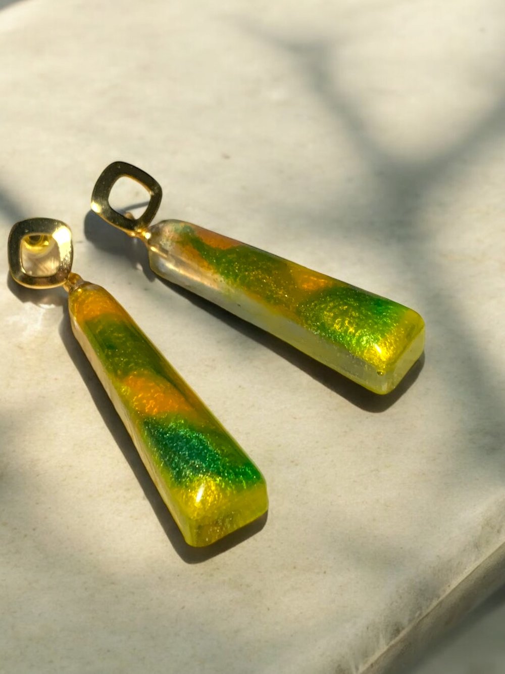 Une création inspirée par la nature : des boucles d’oreilles lumineuses, façonnées à la main, où se mêlent des nuances irisées de vert profond et d’orangé ambré. Un bijou unique, léger et élégant, à la fois naturel et raffiné.