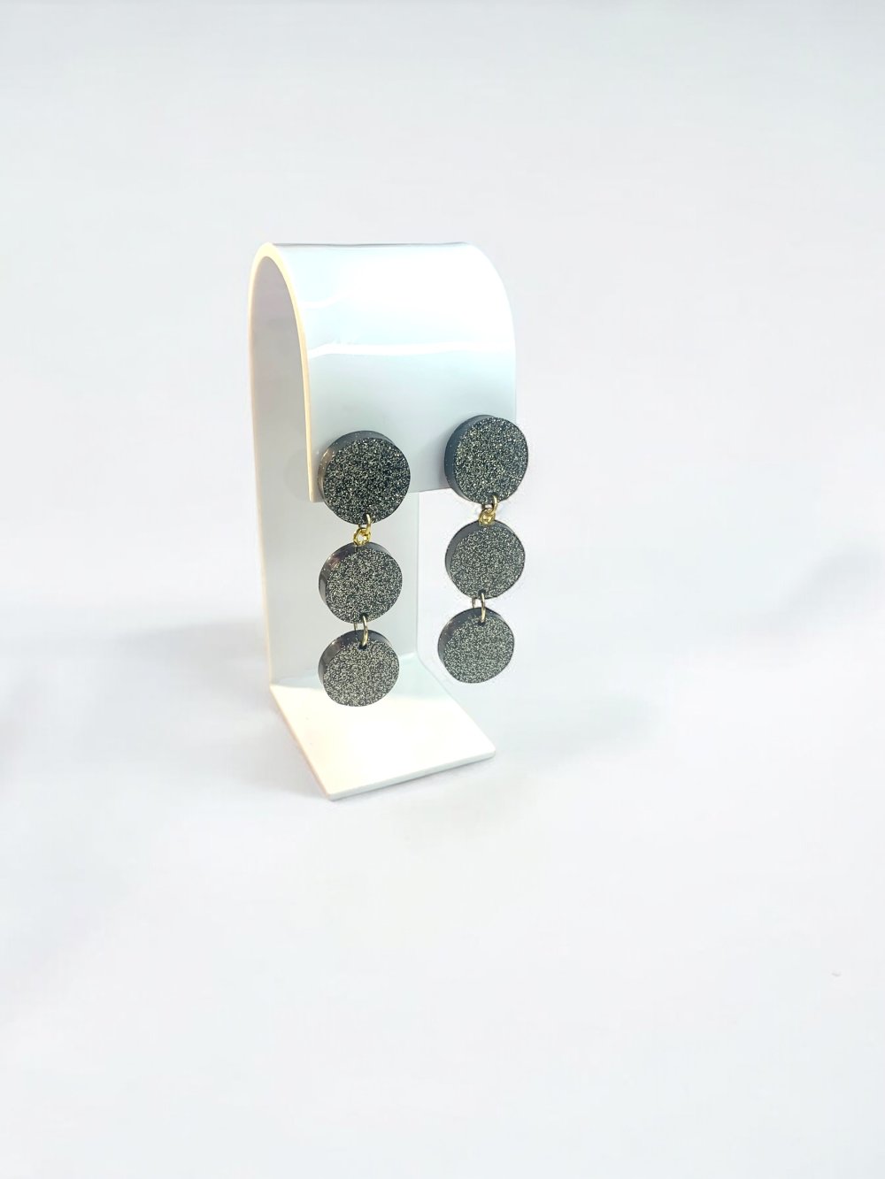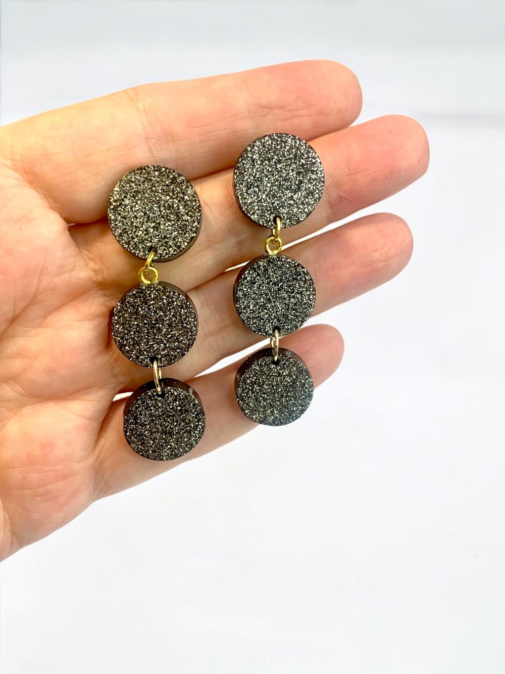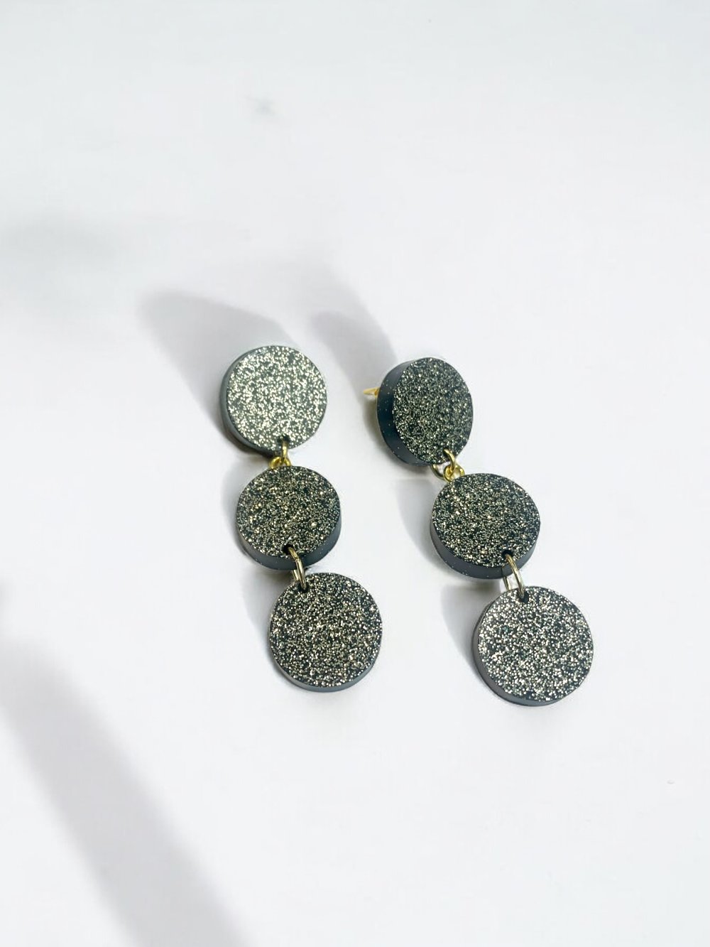Boucles d’oreilles pendantes composées de trois disques en résine dorée pailletée. Un design géométrique raffiné, léger et éclatant — parfait pour briller avec élégance.