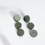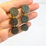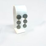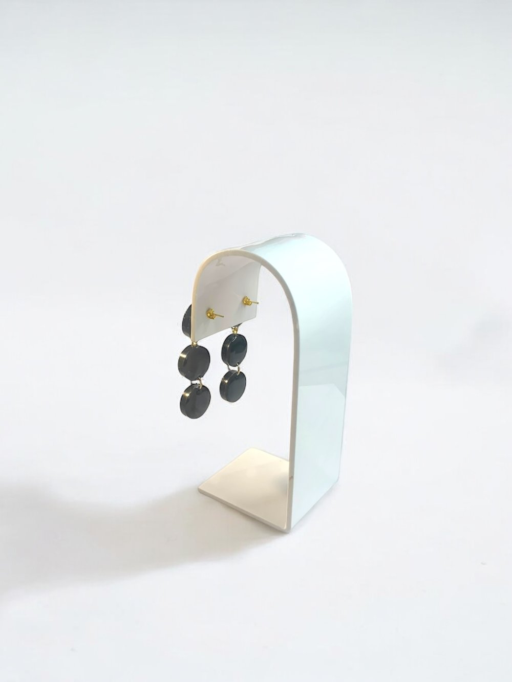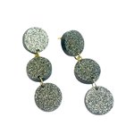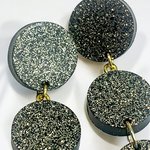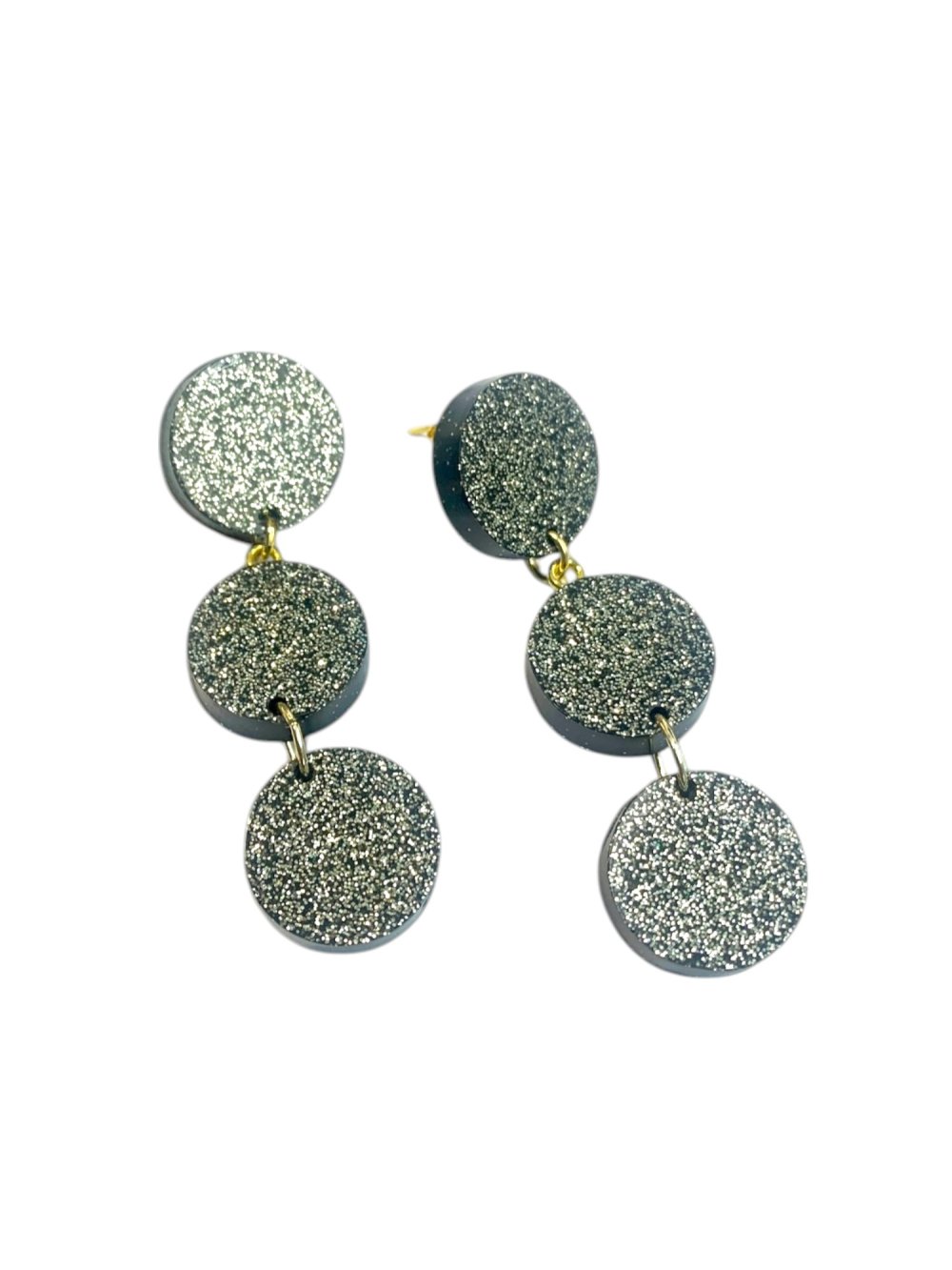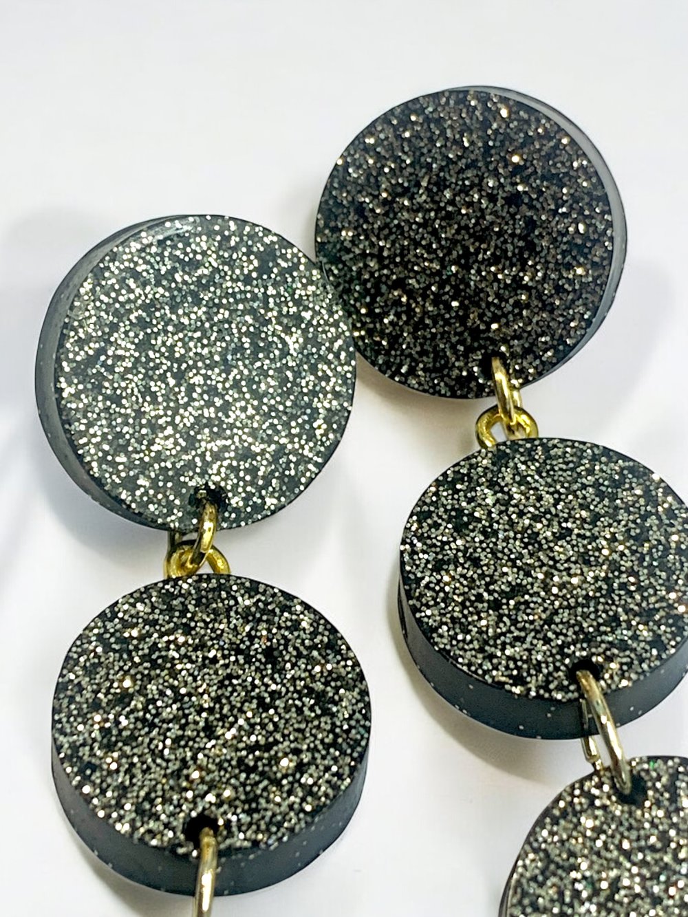 Boucles d’oreilles pendantes composées de trois disques en résine dorée pailletée. Un design géométrique raffiné, léger et éclatant — parfait pour briller avec élégance.