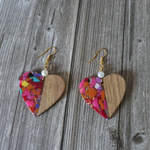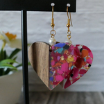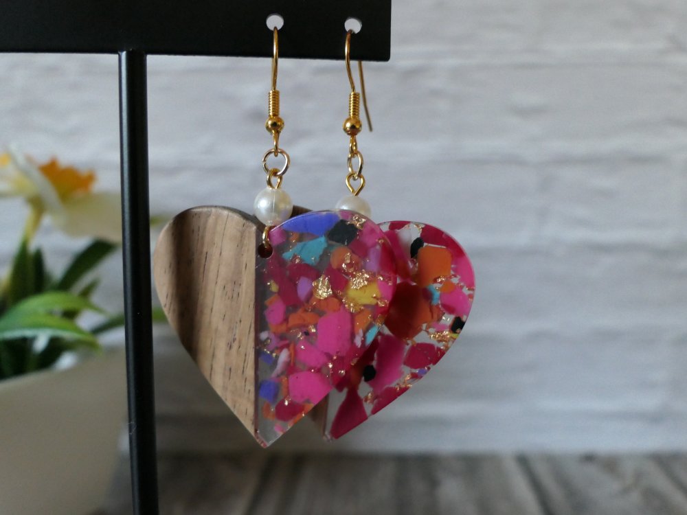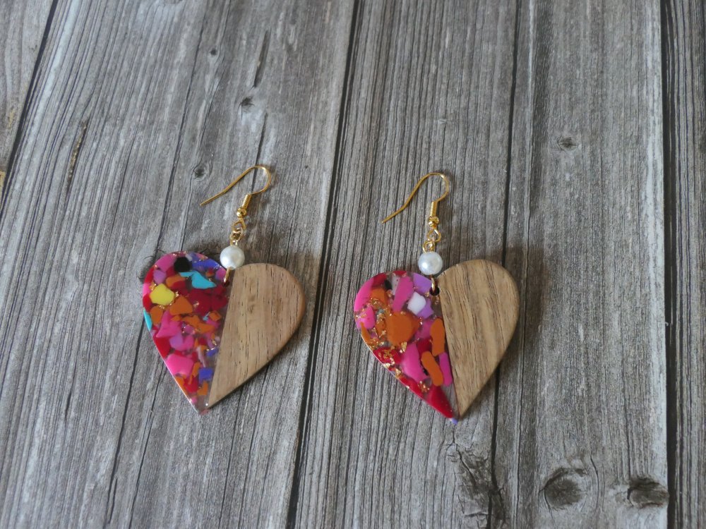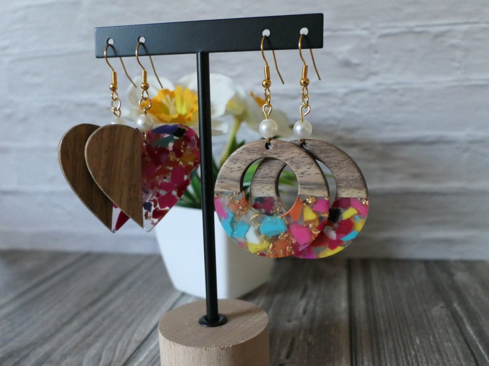 Boucles d’oreilles en bois & résine colorée | Bijou artisanal léger | Forme cœur ou cercle | Style bohème chic