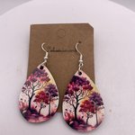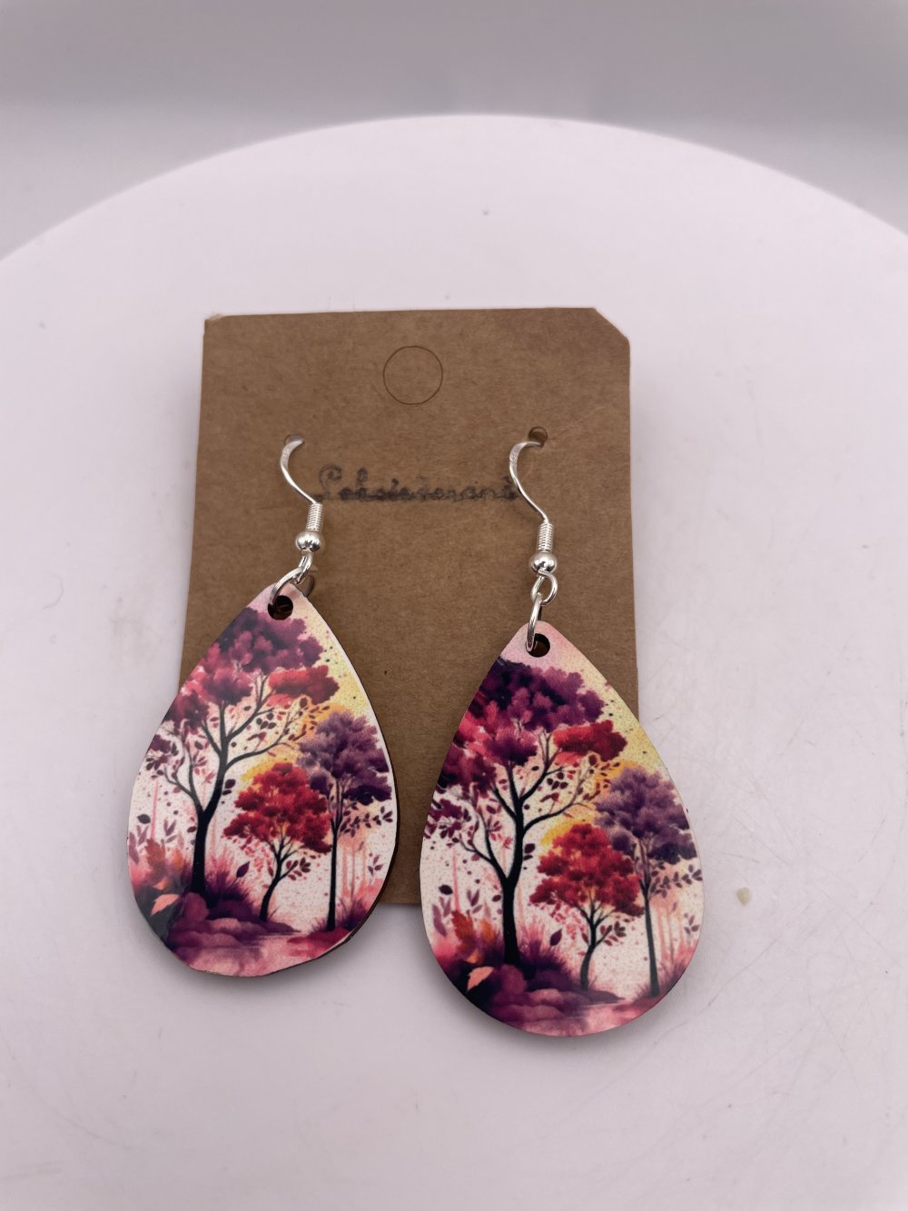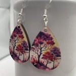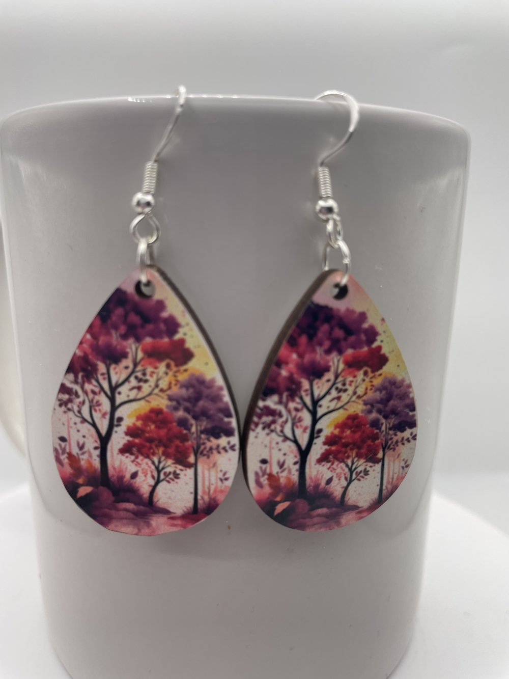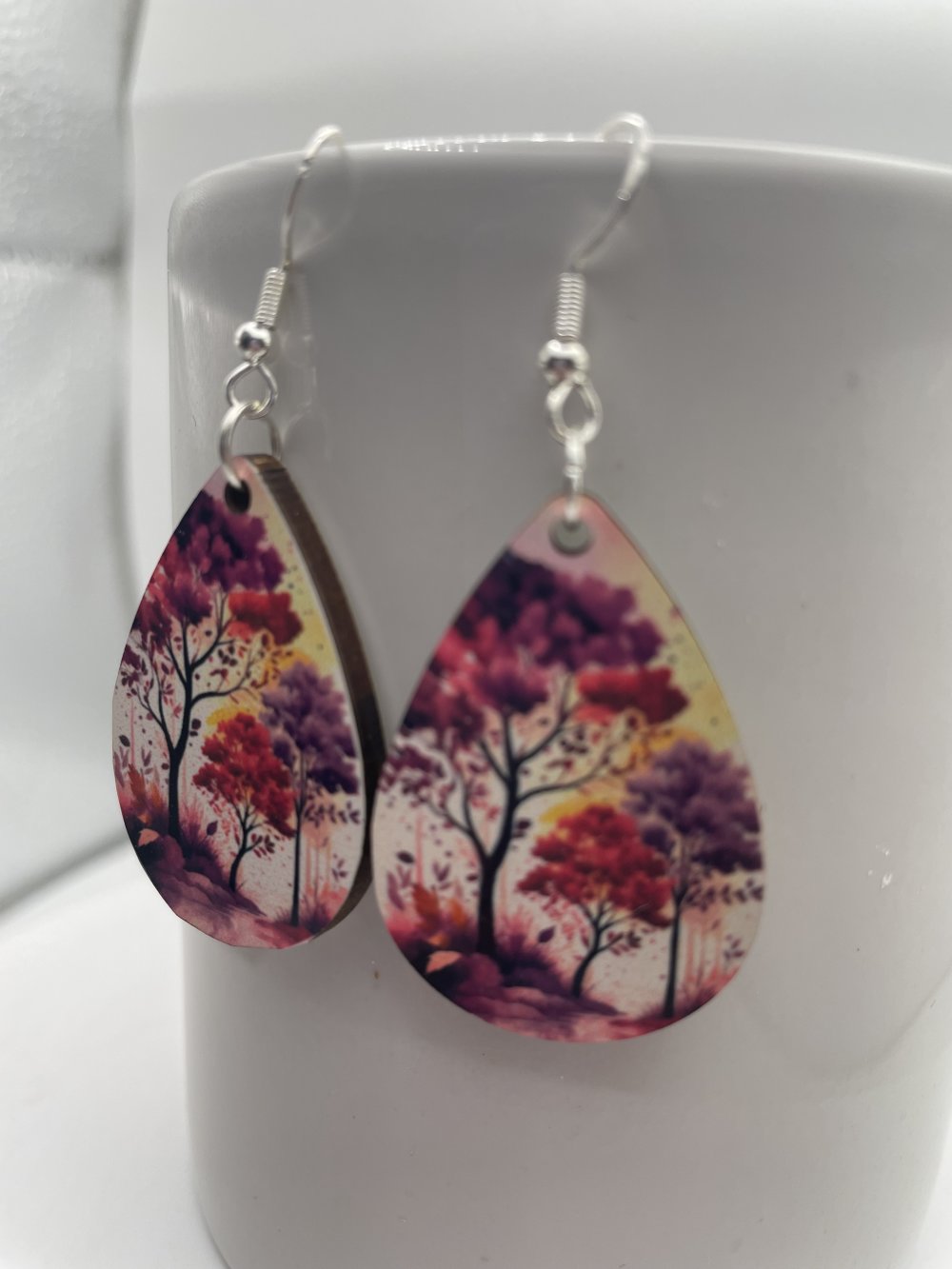 Boucles d’oreilles en bois , impression par sublimation, forme gouttes pendantes ,arbre ton mauve violet