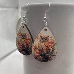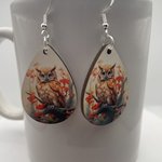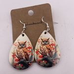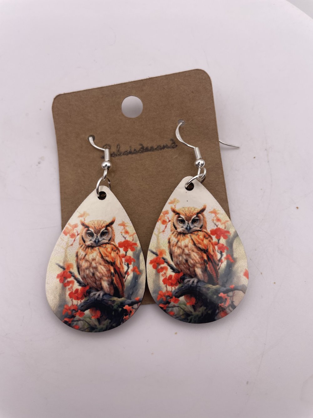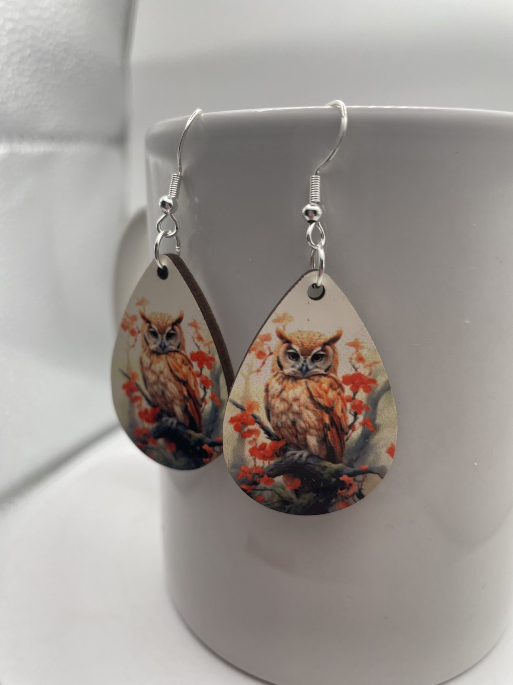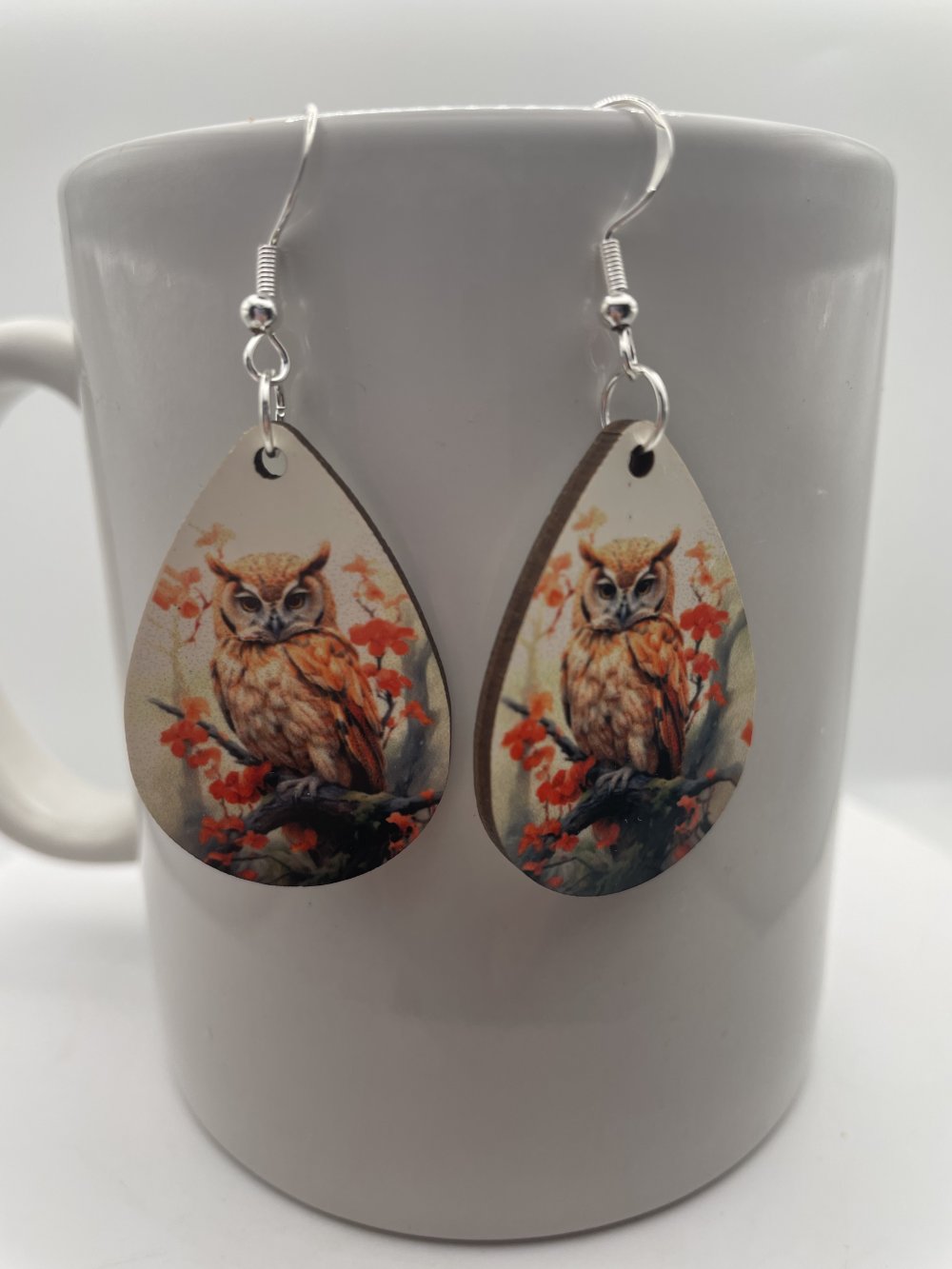 Boucles d’oreilles en bois , impression par sublimation, forme gouttes pendantes hibou