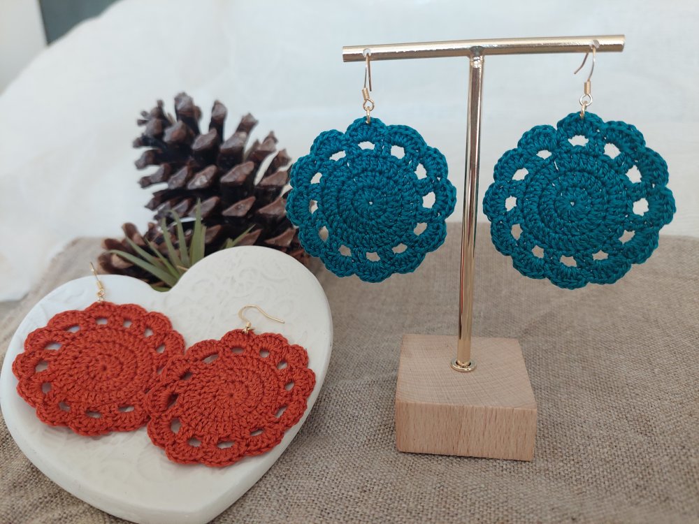 Boucles d'oreilles en coton réalisées à la main en crochet.