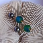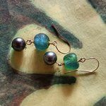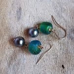 Boucles d'oreilles montée sur de l'or, ornées de perles de Tahiti et de magnifiques perles africaines transparentes en verre aux reflets verts et bleus